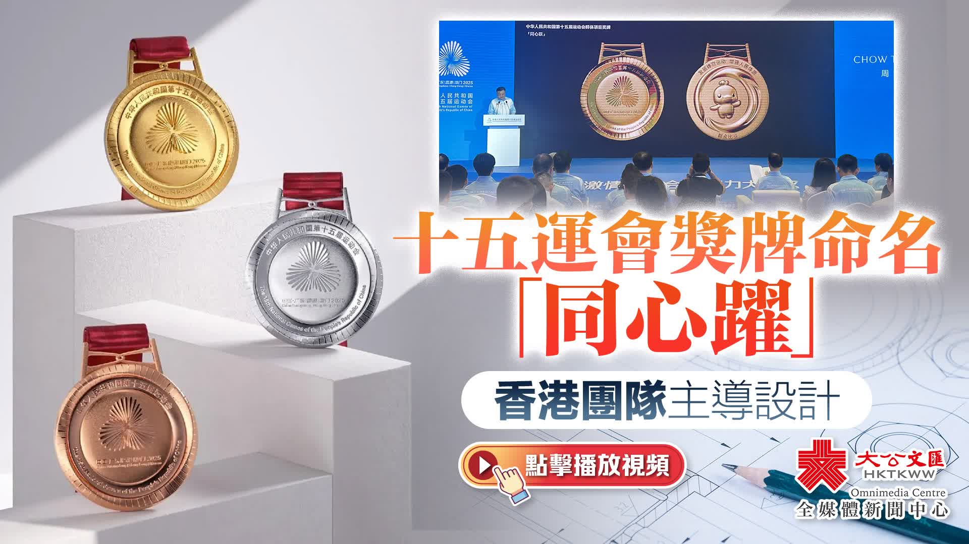 (大公文匯網 記者 敖敏輝 廣州報道)10日,第十五屆全國運動會(簡稱「十五運會」)獎牌發布儀式在廣州舉行,競體項目和群體項目金牌、銀牌、銅牌正式設計樣式正式公布。十五運會獎牌命名為「同心躍」,代表大灣區粵港澳三地同心協力,共躍未來。