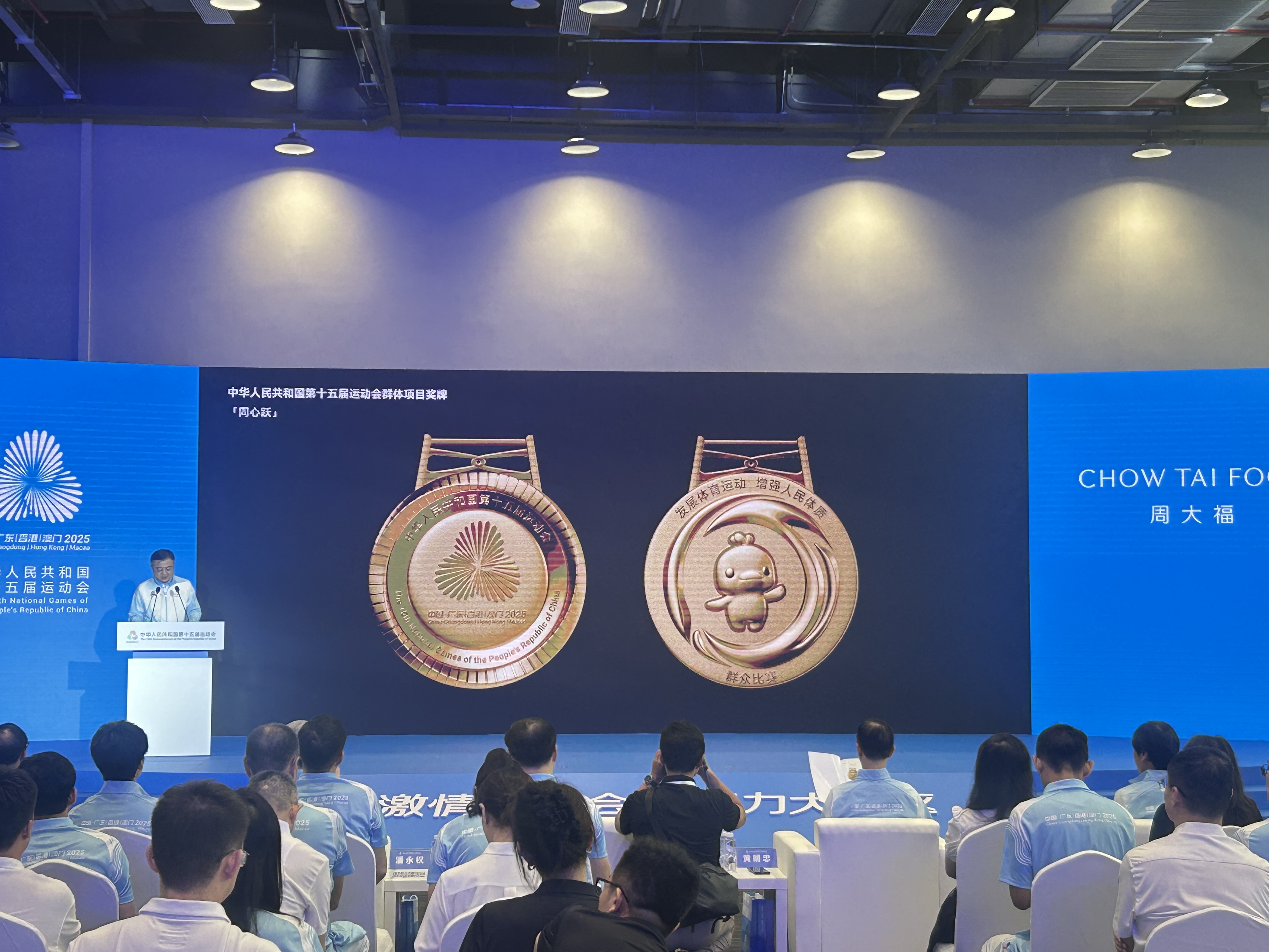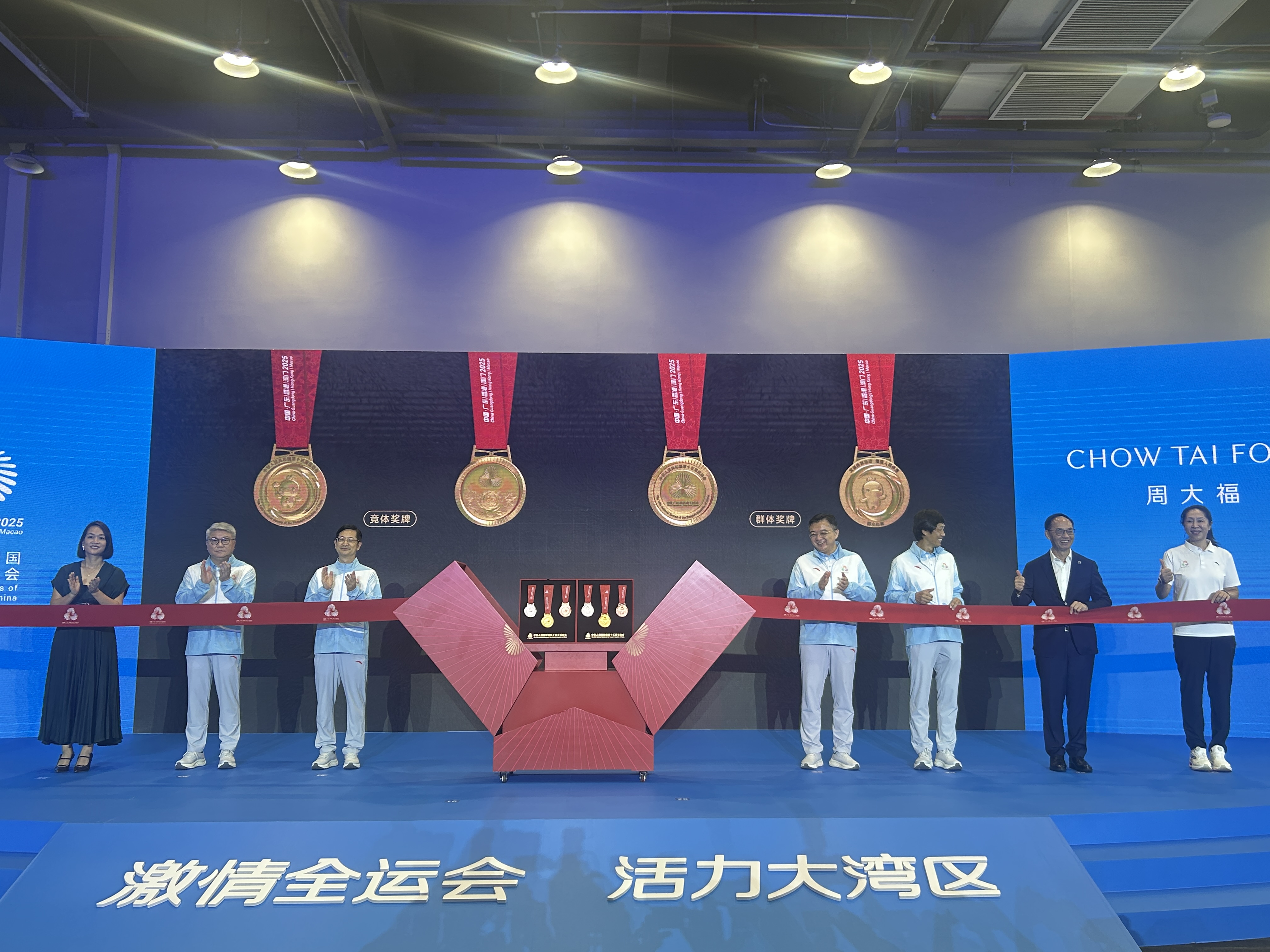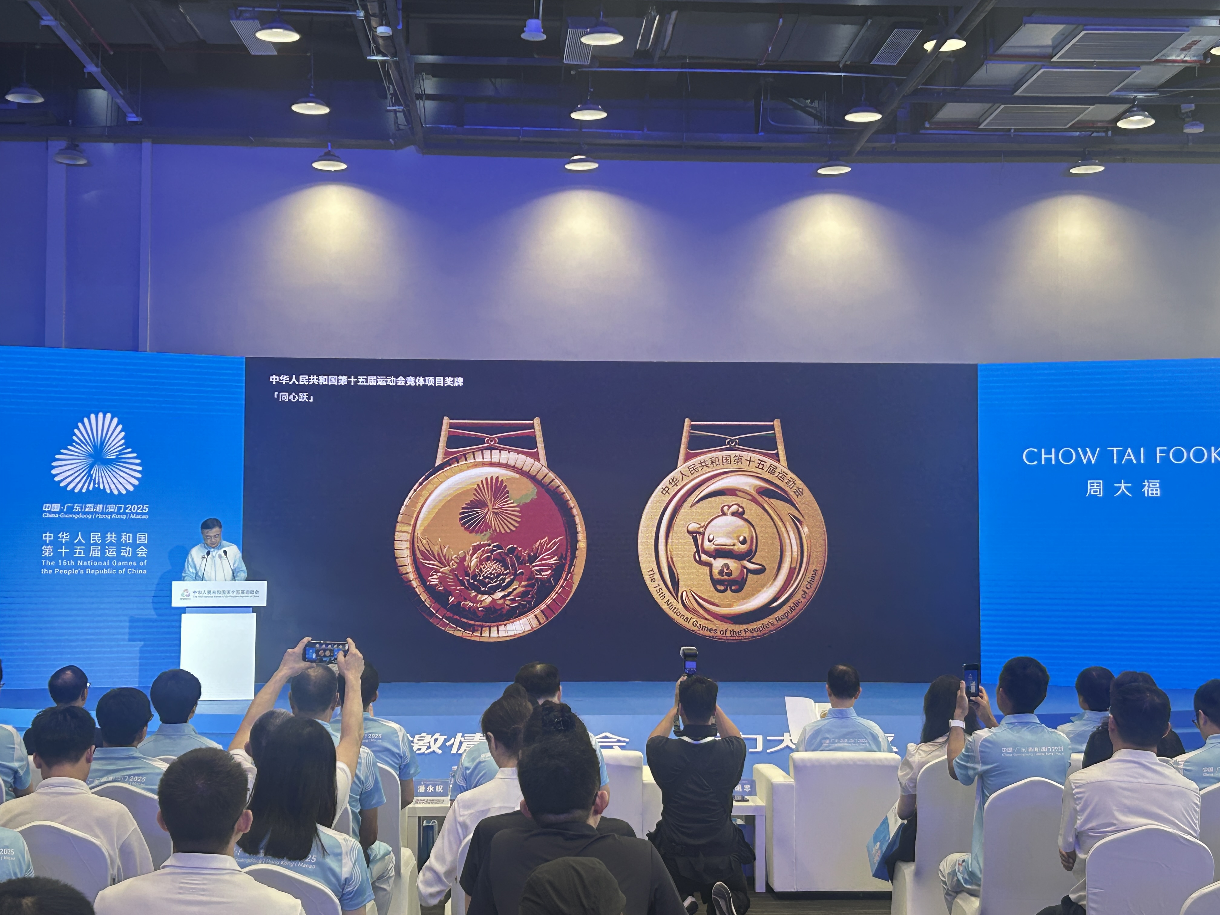 獎牌的緞帶設計以「中國紅」為基調,而緞帶圖案採用「三花映牡丹」主題花紋,將牡丹花、木棉、紫荊花和蓮花融入其中,比喻三地同心協力、綻放光彩相互輝映,盡顯中式美學的典雅韻味。值得一提的是,十五運會獎牌設計團隊主要來自香港周大福珠寶集團,包括香港十大設計師榮譽獲得者林鴻勝、香港啟德體育園品牌視覺識別系統操刀設計師黎偉傑等。