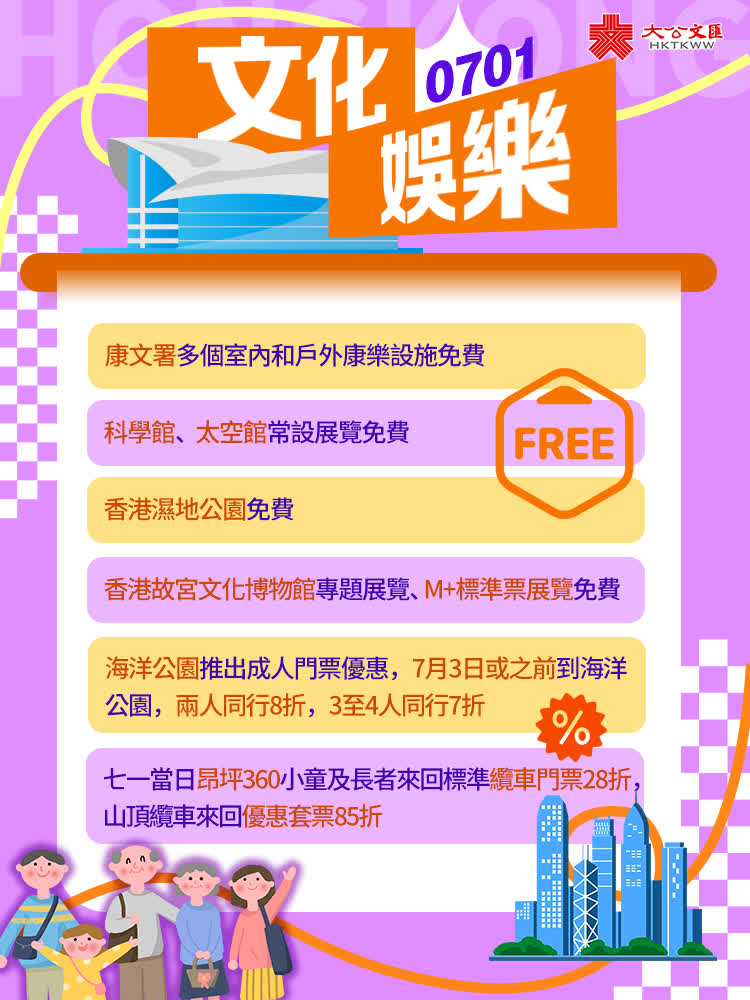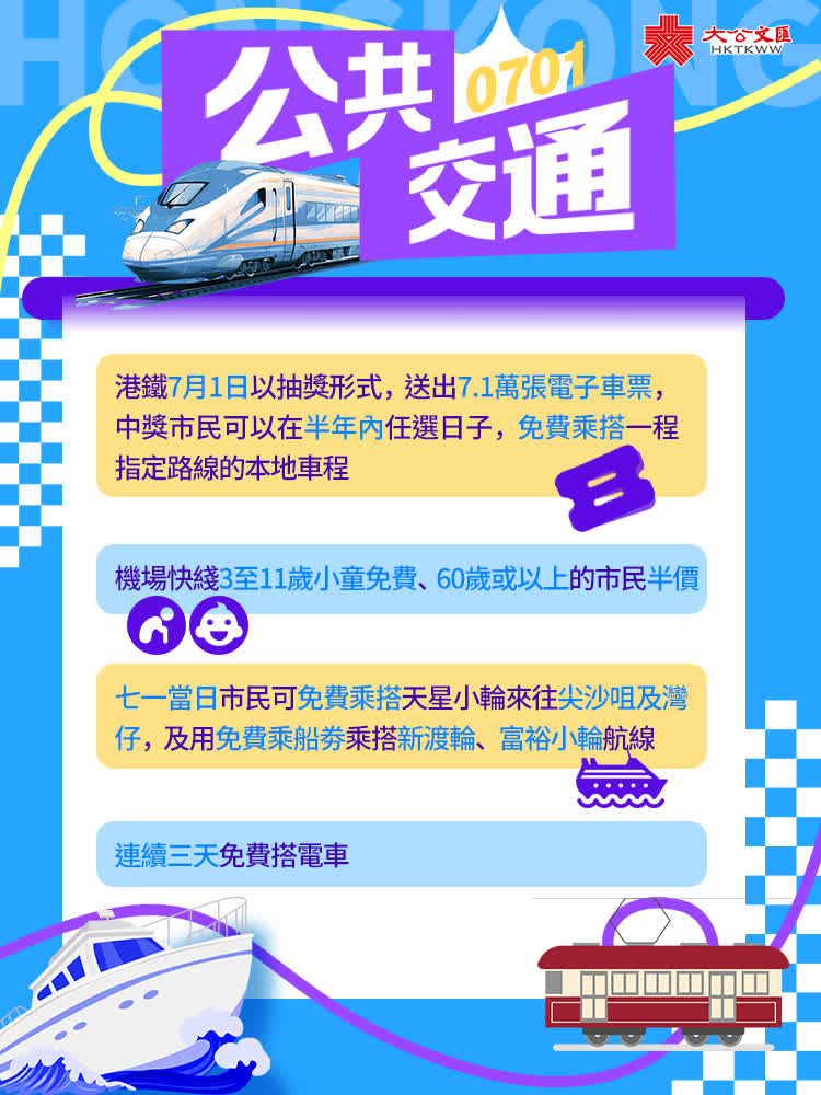 - 七一當日市民可免費乘搭天星小輪來往尖沙咀及灣仔,及用免費乘船劵乘搭新渡輪、富裕小輪航線