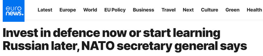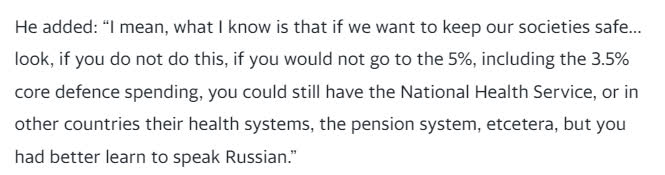 呂特說:「如果你們不(把軍事化支出)提高到5%,包括3.5%的核心國防開支,你們仍然可以保留醫療系統、養老金系統等等,但你們最好學會說俄語。」