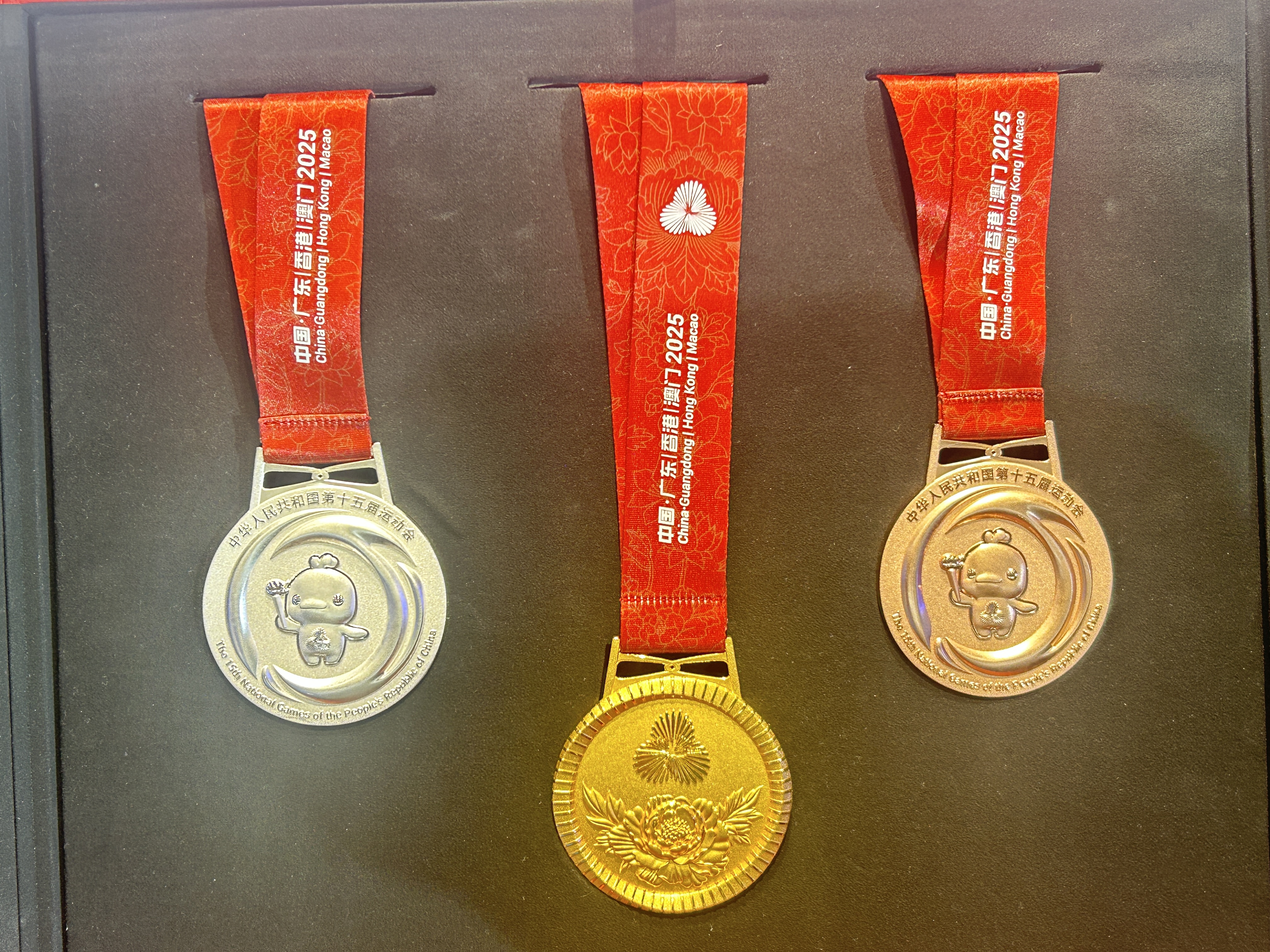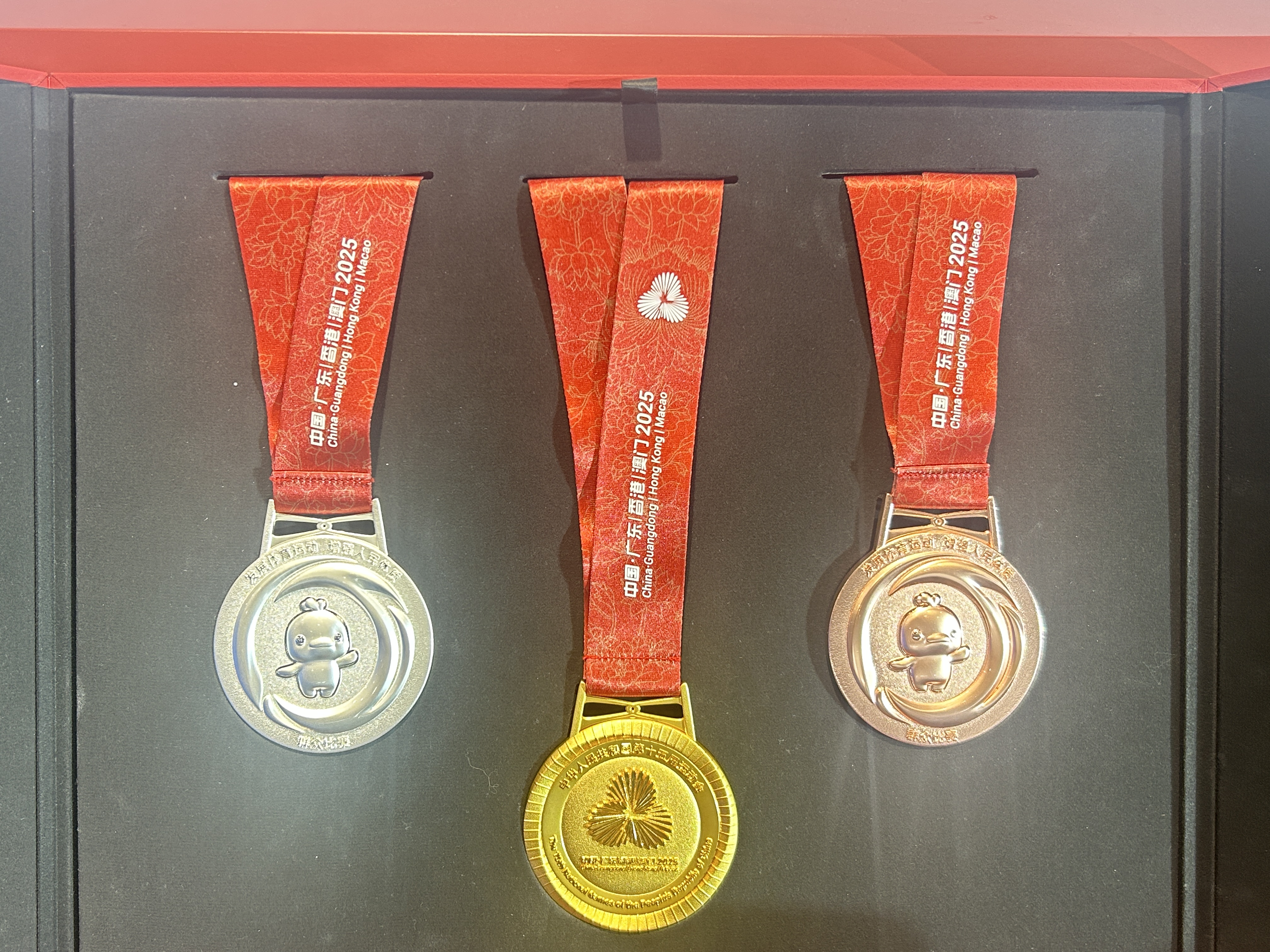 獎牌的緞帶設計則以「中國紅」為基調,緞帶圖案同樣採用「三花映牡丹」主題花紋,將牡丹花、木棉花、紫荊花、蓮花融入其中,比喻三地同心協力、綻放光彩相互輝映,盡顯中式美學的典雅韻味。