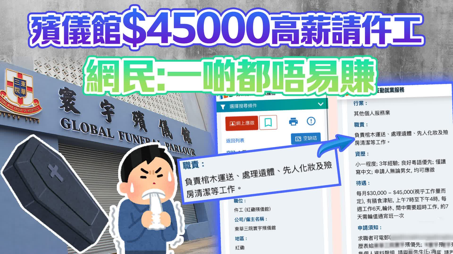 大公文匯全媒體報道,有殯儀館日前登出招聘廣告,公開請仵工,月薪高達$30000至$45000元,甚至只需要小一學歷,引發網民熱議。
