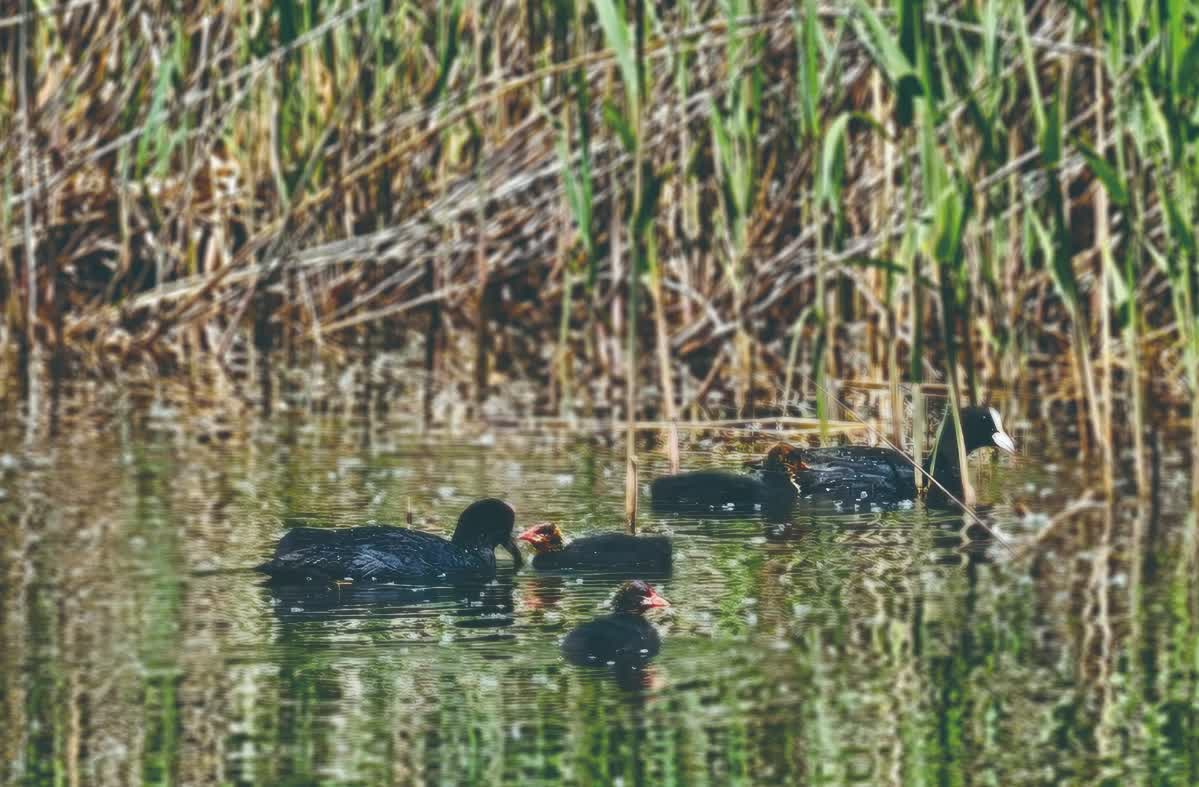 在不遠處的水域,白骨頂雞一家成為眾人關注的焦點。幾隻剛剛出窩的幼鳥,圓滾滾、毛茸茸的,正好奇地在水中遊動,動作略顯笨拙,還不時發出稚嫩的叫聲。成年白骨頂雞則忙着覓食,它們一頭扎進水裏,再浮出水面時,嘴裏已叼着小魚小蝦,隨後快速遊向幼鳥餵食。幼鳥們爭搶食物的場景,充滿了趣味。