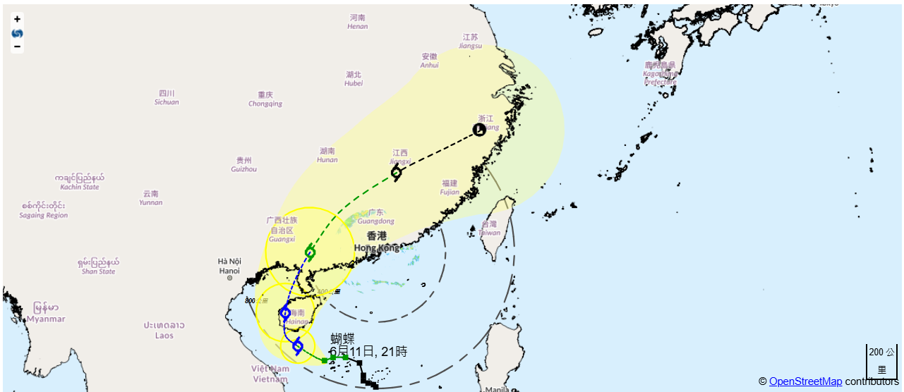 大公文匯全媒體報道,一號戒備信號現正生效。天文台今日(11日)表示,在晚上9時,熱帶風暴「蝴蝶」集結在香港之西南偏南約700公里,即在北緯16.6度,東經111.2度附近,預料向西北偏西移動,時速約12公里,大致移向海南島並逐漸增強,隨後移向雷州半島至北部灣一帶。
