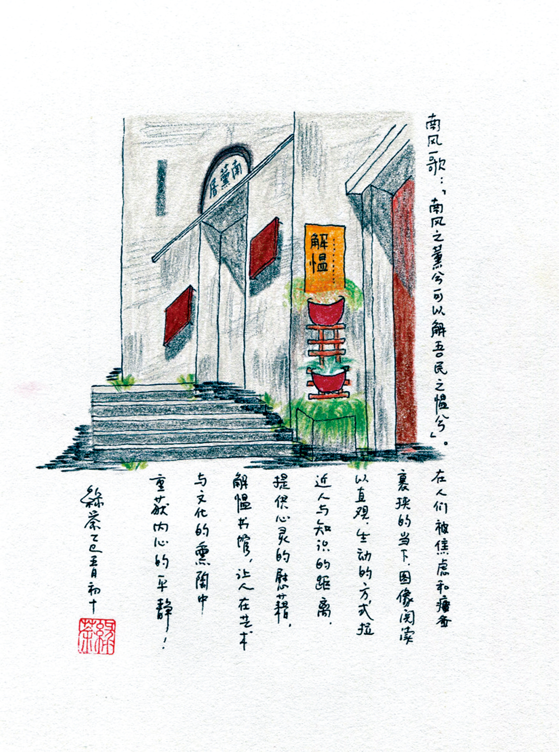 申曉力被這棟古樸的建築深深吸引,那一刻,彷彿有一根無形的線,將歷史與現實緊緊相連,他觸摸到了兩者的交匯點。心中萌生出一個大膽的想法:何不打造一個文化空間,讓更多人在喧囂的都市生活中,也能尋得一方心靈的寧靜之所。「南風之薰兮」已為「南薰居」所用,那就取其後者「可以解吾民之慍兮」,解慍書館由此得名。