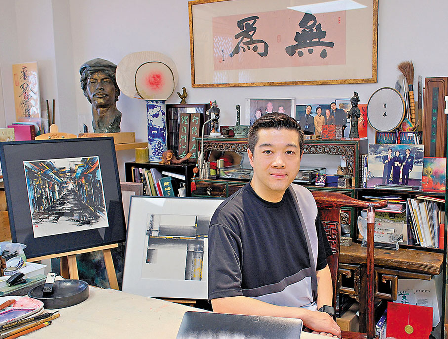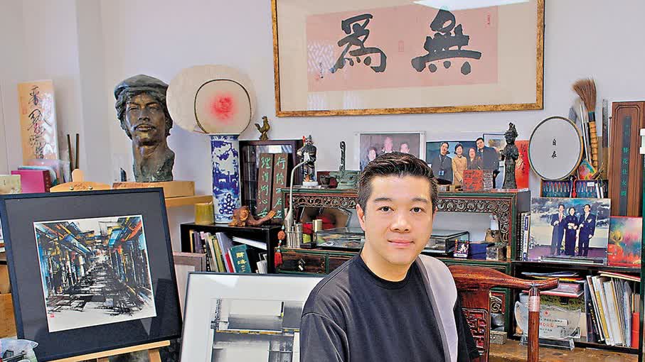 何紀嵐的工作室則坐落於熙熙攘攘的中環,由何百里購入,父子二人共用。創作空間被分成兩半,一邊掛着何百里的水墨畫,一邊則堆滿何紀嵐的作品。何紀嵐表示,選擇中環作為工作室據點的最大原因是其地理位置,他介紹道,中環的裱畫行、畫廊、拍賣行高度集中,藝術品從創作到展示和出售都很方便,因此,這片土地成為藝術家、收藏家與策展人靈感碰撞的天然磁場。