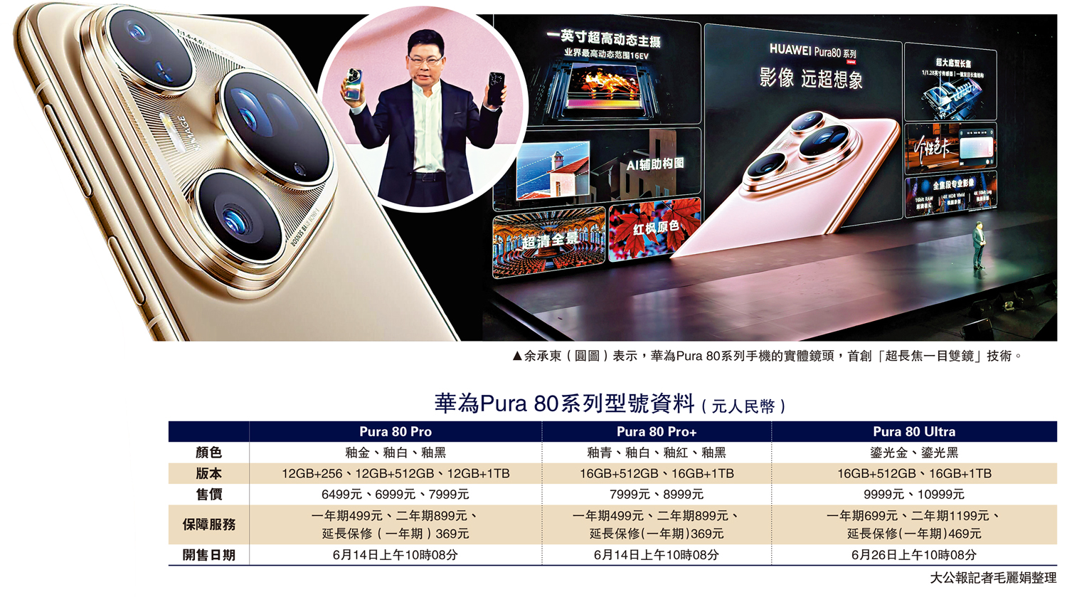 (大公報 記者 毛麗娟)華為Pura 80系列及全場景新品發布會昨日舉行,華為推出全新影像旗艦──Pura 80系列手機。華為常務董事、終端BG董事長余承東在會上透露,過去十年,華為累計研發投入12490億元(人民幣,下同)。2024年,華為研發投入近1800億元,其中600億元用於基礎研究,1200億元用於產品研發,研發費用佔營收比重超過20%。「科技長跑拚的是,長期的研發投入耐力。」他強調,持續的研發投入,為華為在各領域的創新突破提供了不竭動力,並構築起堅實的技術壁壘。