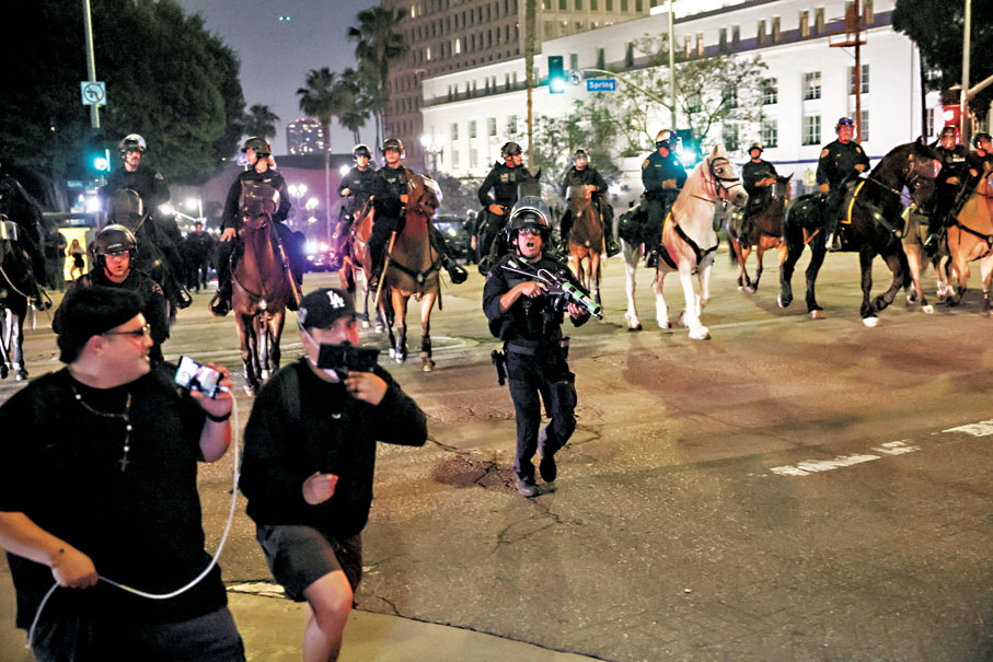 香港文匯報綜合報道,美國加州洛杉磯市長巴斯周二(6月10日)宣布,由於執法人員搜捕非法移民引發的示威衝突升級,洛杉磯市即日進入緊急狀態,中心部分地區實施宵禁,時間為每晚8時至翌日清晨6時,預計持續數天。巴斯強調宵禁令旨在阻止示威進一步演變為騷亂,出現破壞搶劫行為。總統特朗普揚言,已待命的海軍陸戰隊成員,以及更多國民警衛隊成員會繼續部署至洛杉磯,直至出現「和平」為止。