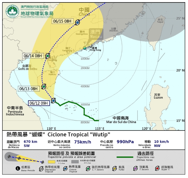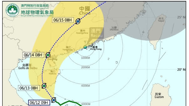 澳門氣象局指,按現時預測路徑,「蝴蝶」明日(6月13日)將轉向北至東北方向移近廣東西部沿岸,與其相關的西南氣流將影響澳門。預料明日稍後至周日(6月15日)初時對澳門影響最為顯著,將有頻密大驟雨及雷暴,累積降雨量較高,低窪地區可能因持續降雨而造成水浸。另一方面,由於未來數日正值天文大潮,疊加風力較大,今日日間內港以南一帶可能出現輕微水浸。