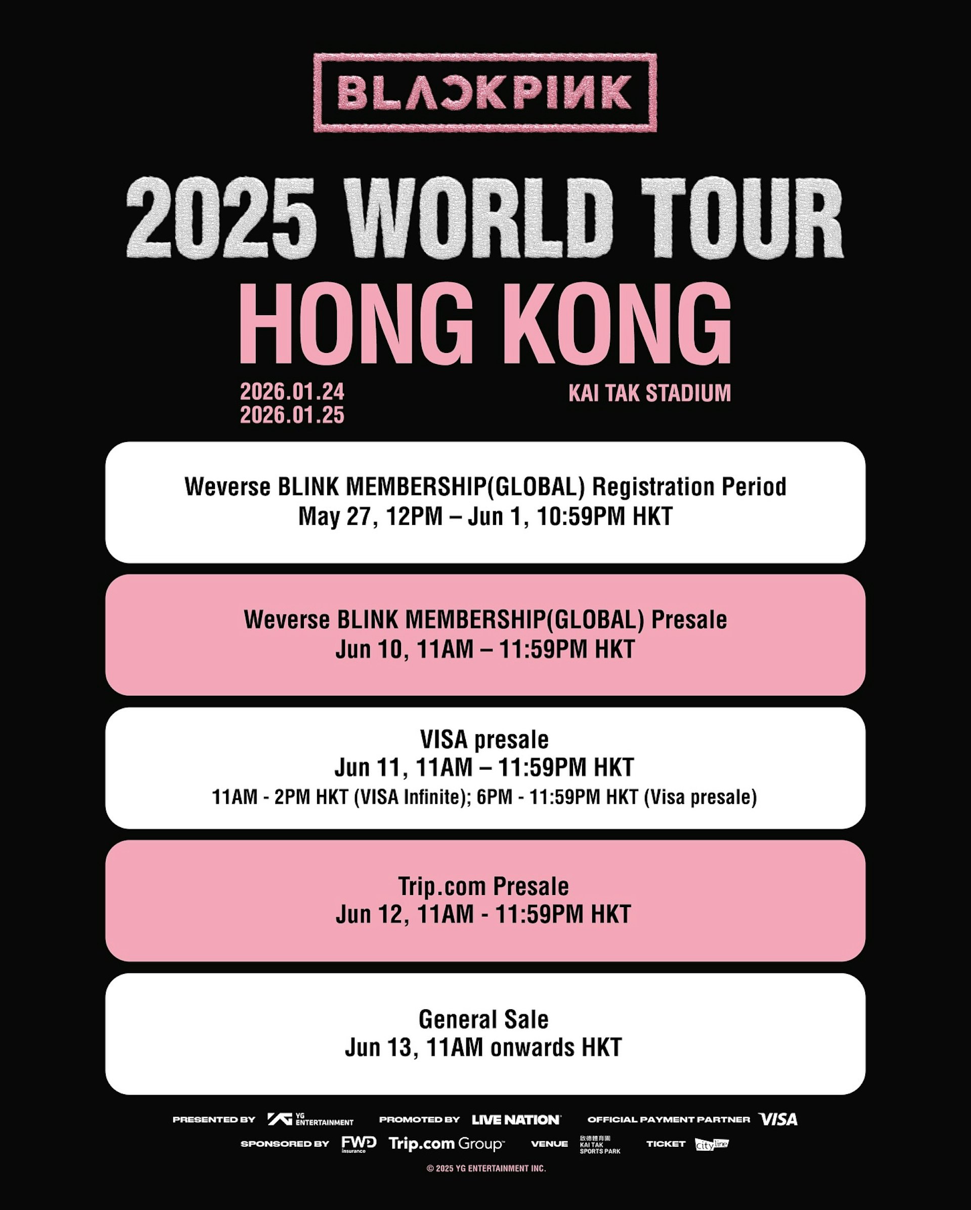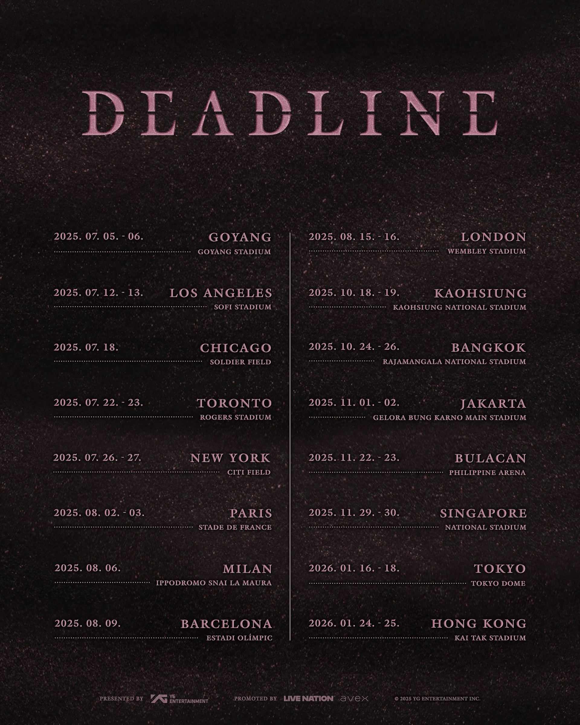 BLACKPINK的第三次世界巡迴演唱會《DEADLINE》,將於7月5日和6日在韓國的高陽綜合運動場展開,其後會去到洛杉磯、紐約、多倫多、巴黎、倫敦等地;亞洲站會去到高雄、曼谷、新加坡、東京等,而萬眾期待的香港站將會在2026年1月24及25日於啟德主場館舉行。