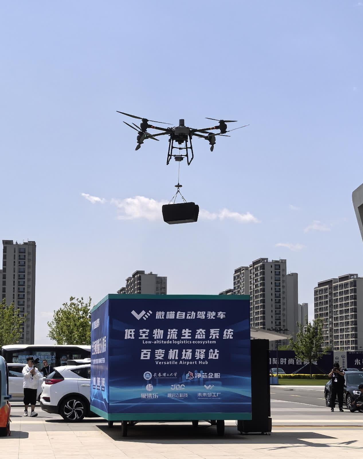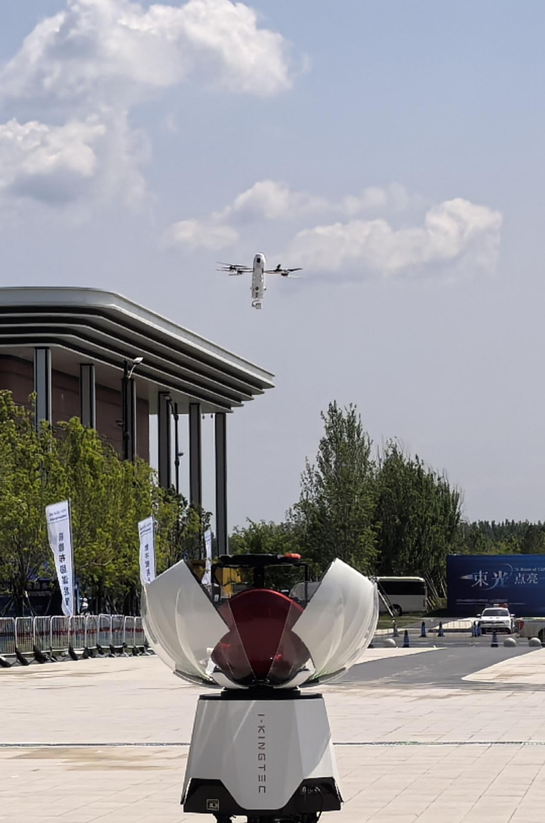 艷陽高照,空中嗡鳴聲起,抬頭,一架無人機正在場館上空飛來,將所攜帶貨物小心放到驛站,隨即又轉身飛走,甚是忙碌。