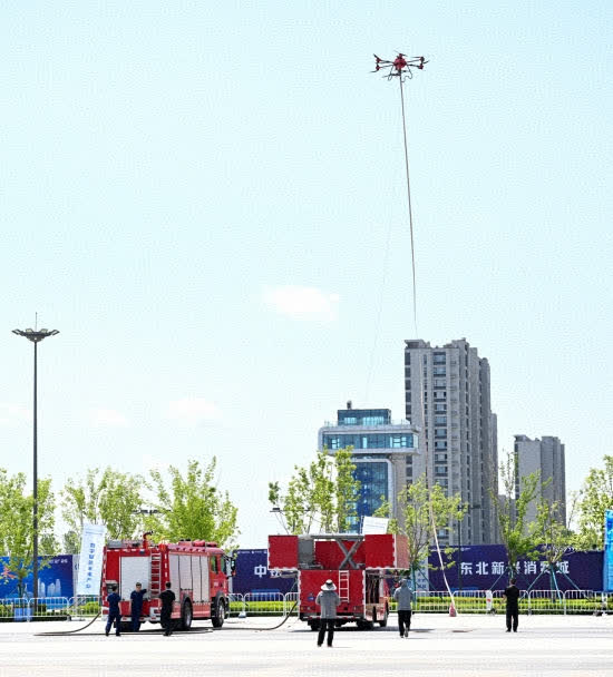 在現場演示中,操作人員僅用3分鐘便完成了一場模擬火災的無人機滅火、無人車疏散協同響應,引得現場觀眾連連讚嘆。這款搭載在消防作業保障車上的無人機滅火系統,依靠地面供電,可以長時間懸停在空中,不間斷滅火,再也不用頻繁起降;斷槳保護、斷電保護等多種安全措施,給作業上足「安全鎖」。