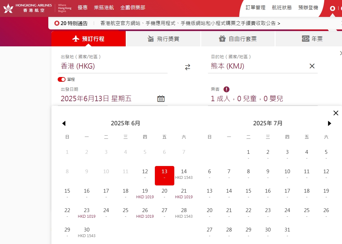 多個旅遊資訊平台昨日(11日)指出,港航將於7月起停飛鹿兒島、熊本,並在7月及8月縮減來往名古屋的班次至每周一班,而該航線將於9月起停飛。點新聞記者於港航網站搜尋7月起飛往鹿兒島、熊本的航班,系統顯示「抱歉!沒有航班可選」。至於名古屋航線,7月及8月僅維持每周一班,9月則未顯示任何航班。