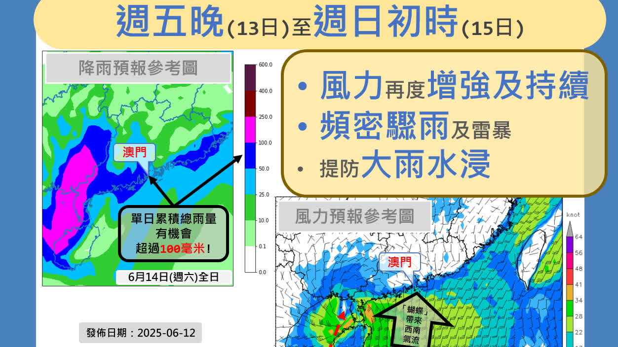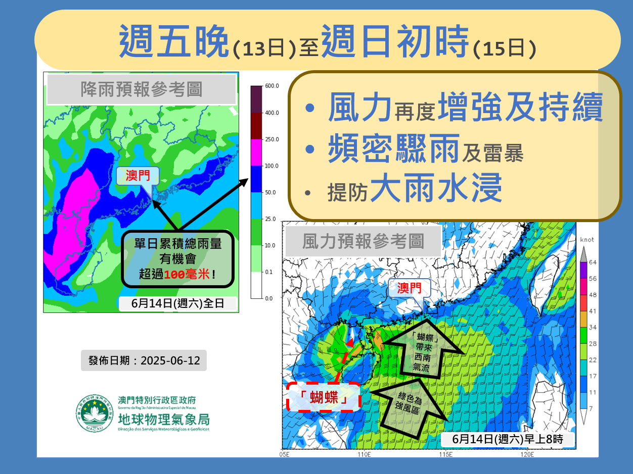 但澳門氣象局續指,按現時預測路徑,「蝴蝶」本周五(13日)將轉向北至東北方向移近廣東西部沿岸,與其相關的西南氣流將影響澳門,風力會再次增強。預料周五(13日)稍後至周日(15日)初時將有頻密大驟雨及雷暴,累積降雨量較高,低窪地區可能因持續降雨而造成水浸。另一方面,由於未來數日正值天文大潮,周五至周六(13至14日)日間內港一帶可能出現輕微水浸。
