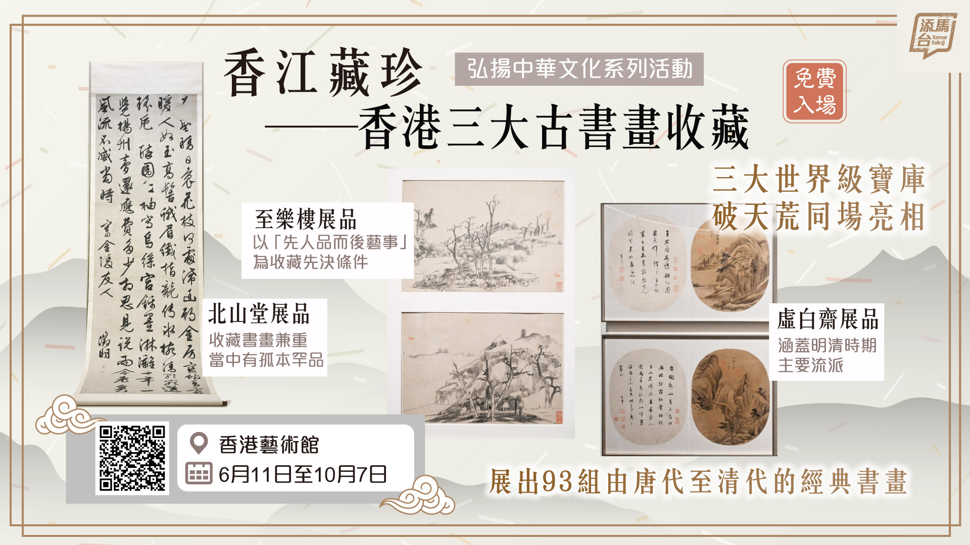 香港藝術館由即日起推出「香江藏珍──香港三大古書畫收藏」展覽,首次讓三大世界級寶庫—包括由已故本地收藏巨擘劉作籌建立的「虛白齋」、何耀光的「至樂樓」以及利榮森的「北山堂」,同場亮相,精選93組橫跨唐代至清代的中外文化傳世瑰寶,見證香港收藏界的輝煌時代。
