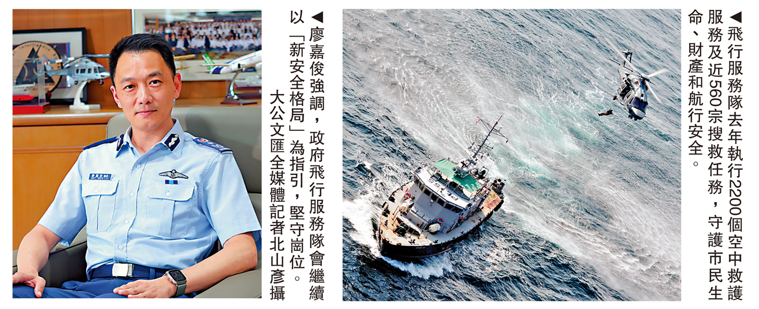 廖嘉俊強調,政府飛行服務隊會繼續以「新安全格局」為指引,堅守崗位,既守護國家安全,亦助力經濟發展與民生改善,有信心在國家和特區政府領導下,將進一步提升專業技能,為提升救援技術水平、推動航空業發展作出更大貢獻,共同譜寫香港由治及興的新篇章。