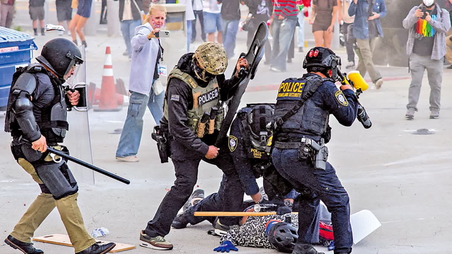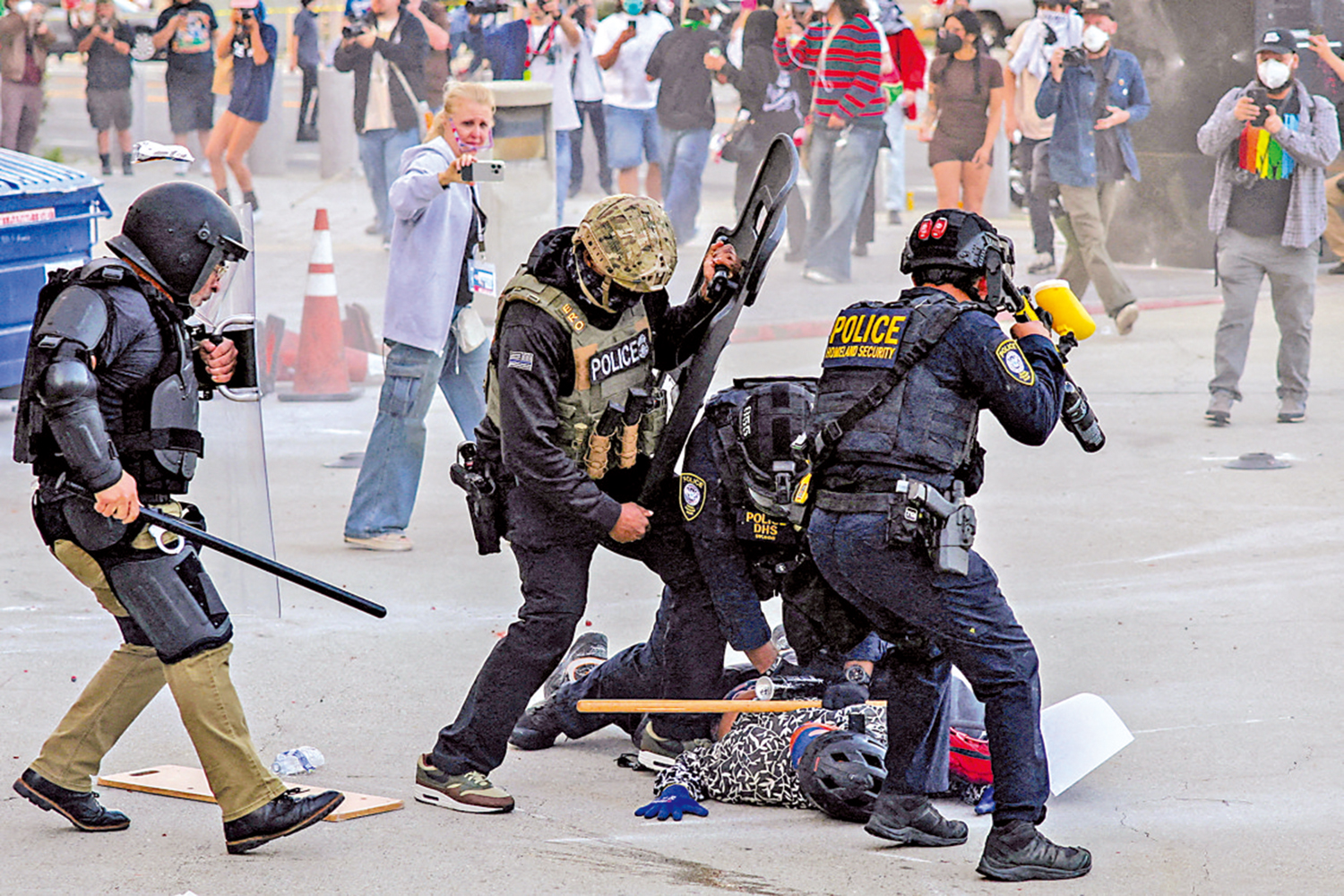 美國這次暴亂,導火線是執法部門針對非法移民進行的強硬執法行動,引發當地嚴重的警民衝突,大批民眾紛紛上街示威,騷亂之火迅速由洛杉磯蔓延至其他城市。一如過往,特朗普隨即重手平亂,出動包括移民局、國民警衛隊、國土安全部、FBI等機構鎮壓,各地烽火連天,催淚彈、震撼彈和橡膠子彈在街頭橫飛,示威者與軍警展開肉搏,擲石頭、「火魔法」、黑衣人、到處塗鴉,這些港人記憶猶新的畫面紛紛在美國上演。所不同的是,與香港警隊的克制相比,美國軍警一開始就往死裏打,不但示威者被打得頭破血流,連不少記者也受池魚之殃,但特朗普半句道歉都沒有,更沒有成立什麼調查委員會,總之大力鎮壓絕不手軟。