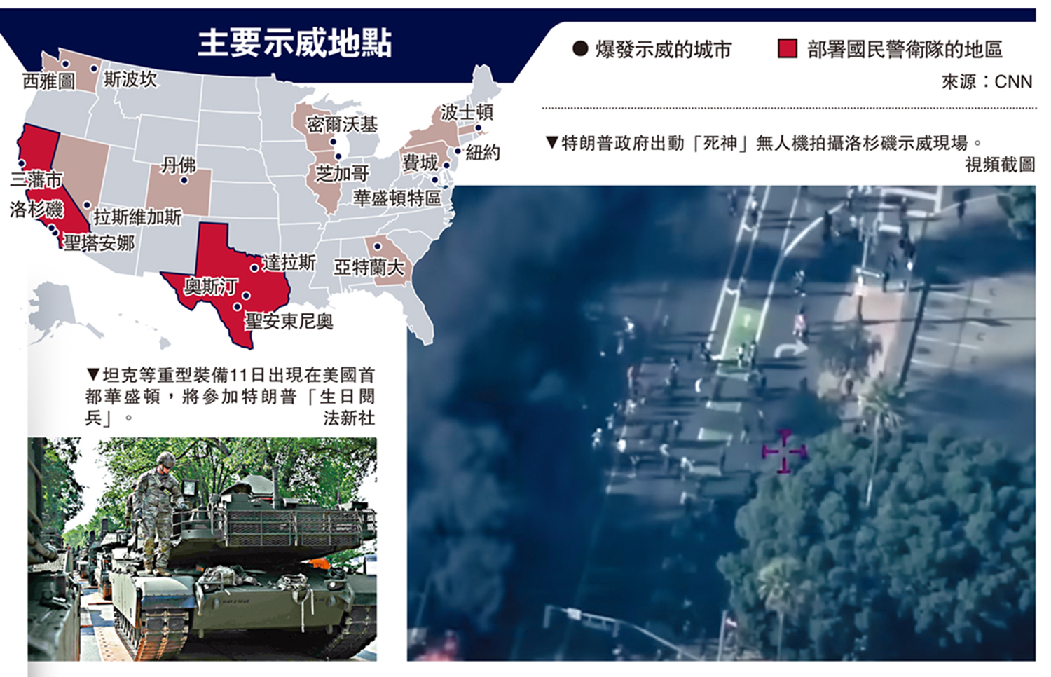 大公報綜合報道,洛杉磯騷亂持續一周,全美更多城市爆發反對美國總統特朗普移民政策的示威。洛杉磯市中心10日起實施宵禁,首晚便有逾200人被捕。華盛頓州第二大城市斯波坎亦宣布11日起在市中心實施宵禁。同日,美國國土安全部下屬海關與邊境保護局(CBP)證實,該機構的MQ-9「死神」無人機近日一直在洛杉磯上空飛行,監視示威者,引發爭議。