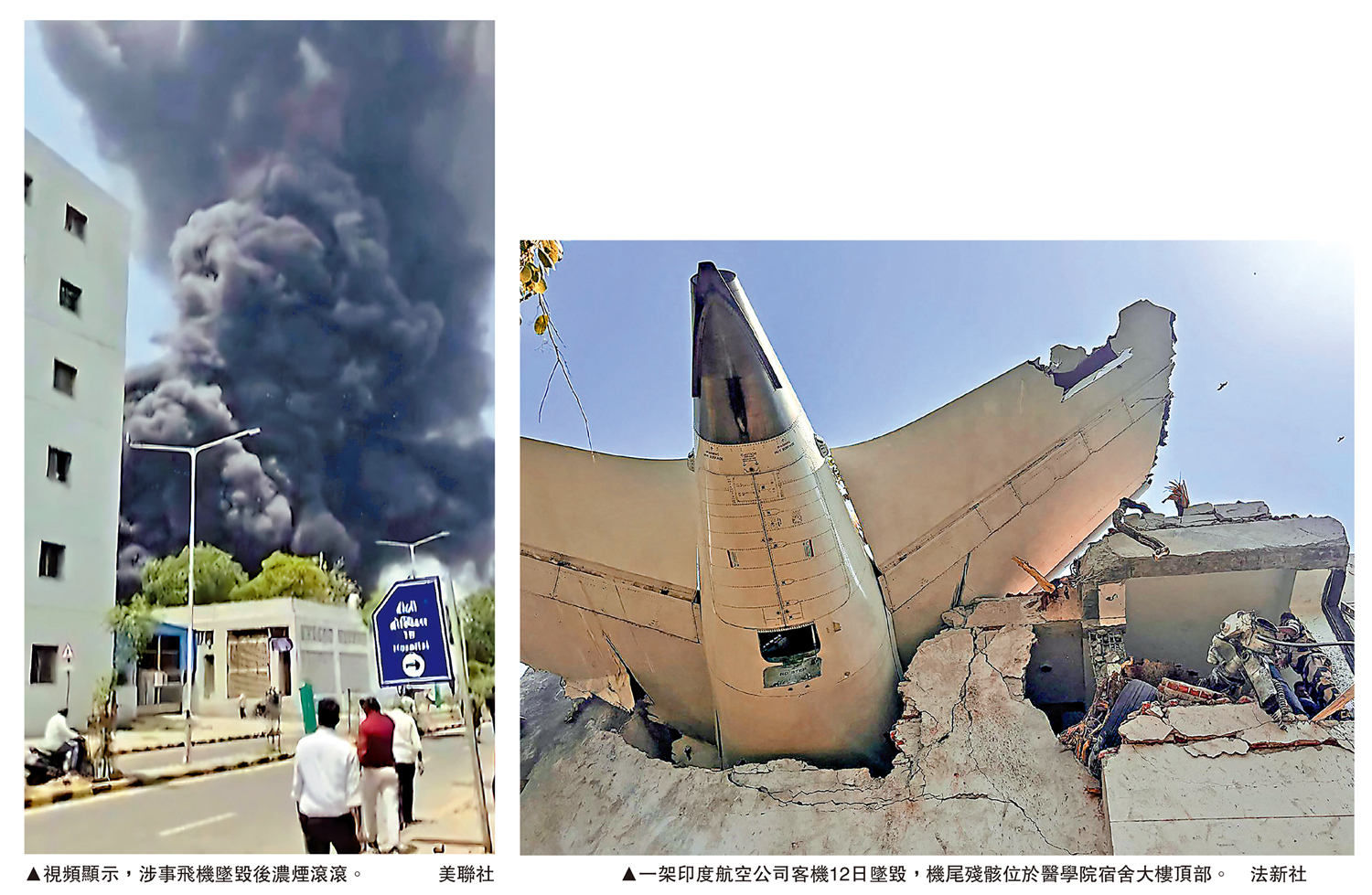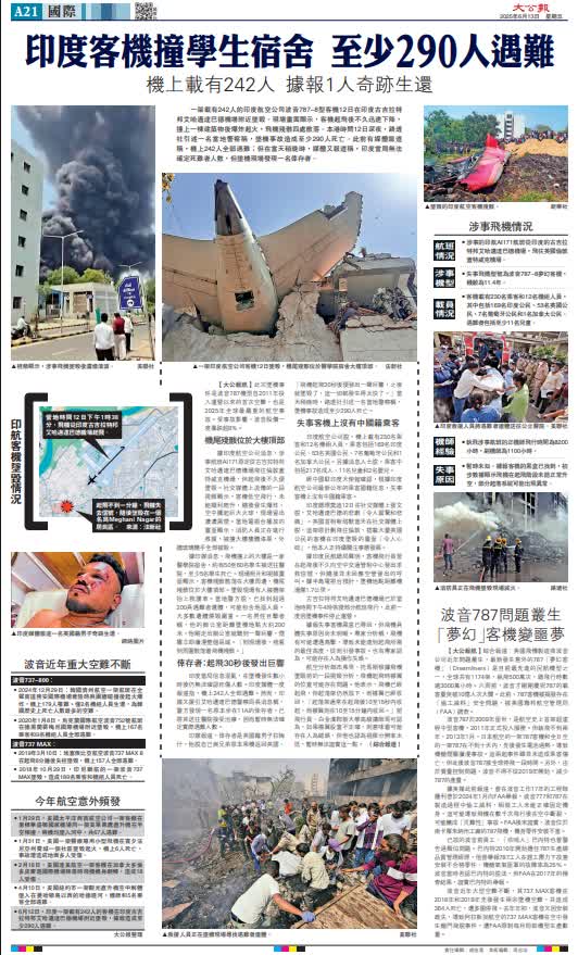 大公報綜合報道:一架載有242人的印度航空公司波音787-8型客機12日在印度古吉拉特邦艾哈邁達巴德機場附近墜毀。現場畫面顯示,客機起飛後不久迅速下降,撞上一棟建築物後爆炸起火,飛機殘骸四處散落。本港時間12日深夜,路透社引述一名當地警察稱,墜機事故造成至少290人死亡。此前有媒體報道稱,機上242人全部遇難;但在當天稍晚時,媒體又報道稱,印度當局無法確定死難者人數,但墜機現場發現一名倖存者。