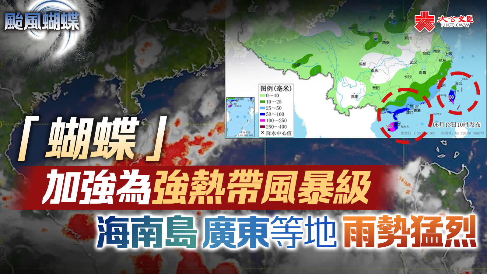 大公文匯網報道,中央氣象台今晨(6月13日)同時發布颱風黃色預警和暴雨黃色預警,今年第1號颱風「蝴蝶」(熱帶風暴級)已於昨天(12日)晚上加強為強熱帶風暴級。今晨「蝴蝶」中心附近對流明顯加強,但仍保持着偏心結構,中心附近最大風力有10級(28米/秒),中心最低氣壓為982百帕,七級風圈半徑100~260公里,十級風圈半徑60~80公里。