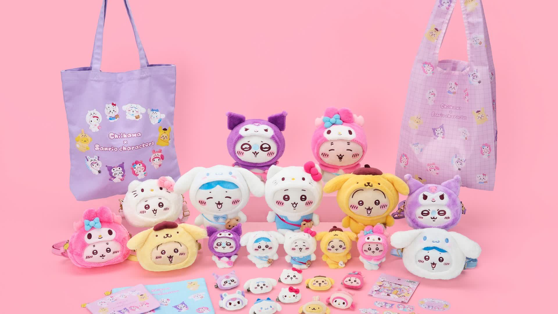 今次推出的限定聯乘商品,包括5款毛絨公仔,每位Chiikawa成員各代表每款Sanrio角色,毛絨公仔頭套可以隨意拆除。還有斜挎包、公仔吊飾、貼紙套裝、環保袋、帆布袋、小袋、小公仔吊飾和髮夾等商品,實用可愛。