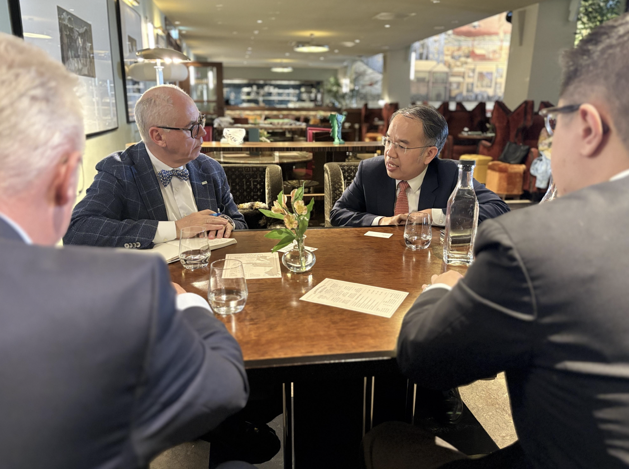 許正宇於當地時間12日禮節性拜會了中國駐挪威王國特命全權大使侯悅。他亦與挪威金融協會政治及社會事務總監Jan Erik Fane及該協會管理人員會面。許正宇提到,挪威主權基金是全球最大的基金之一,是負責任投資的先驅,高度重視環境、社會和管治原則。他表示,香港與挪威同樣關注可持續發展,為兩地合作創造無限機遇。