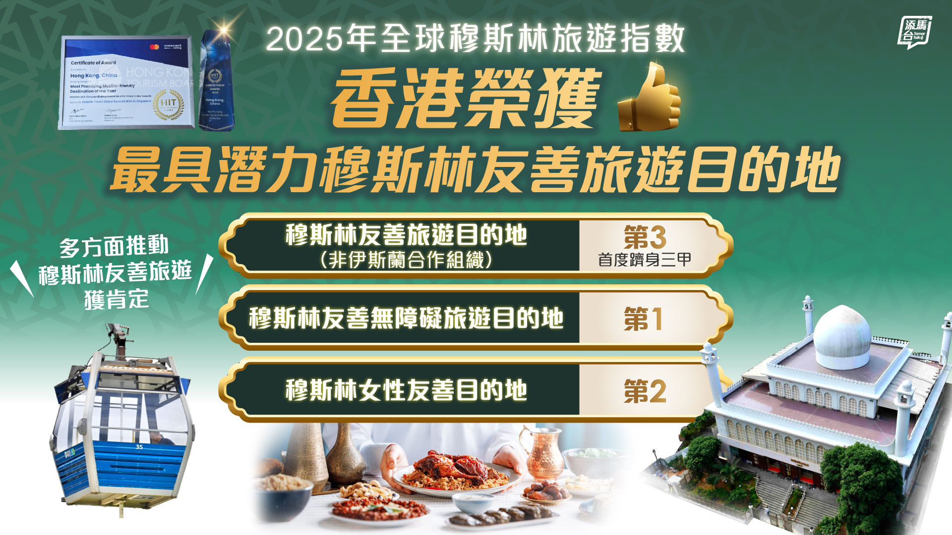 清真旅遊權威機構「新月評等」公布2025年「全球穆斯林旅遊指數」,香港在穆斯林友善旅遊目的地(非伊斯蘭合作組織)的排名由去年的第4名攀升至第3名,首次躋身三甲,同時獲選為最具潛力穆斯林友善旅遊目的地。
