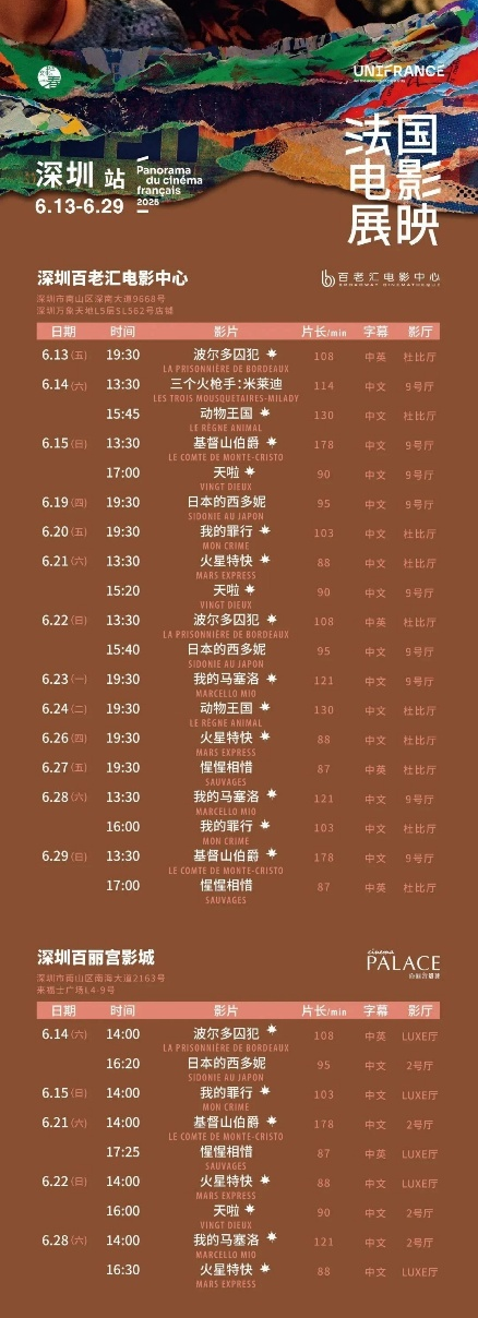 法國電影展映深圳站將從6月13日持續至6月29日,為觀眾奉上數部類型、題材、風格各異的精彩影片,盡可能在選片中呈現當下法國電影的多樣性,滿足不同觀眾的觀影期待,其中包括《動物王國》《基督山伯爵》《我的罪行》《三個火槍手:米萊迪》等影片。這些作品涵蓋了喜劇、悲劇、動作、懸疑、科幻、動畫片,講述着浪漫動人的愛情、動盪不安的青春、自我的掙扎、溫暖的互助、正義與救贖、懷念與新生……其中多部曾入選戛納、威尼斯、安納西等國際知名電影節,並斬獲法國電影凱撒獎等多個重要獎項。