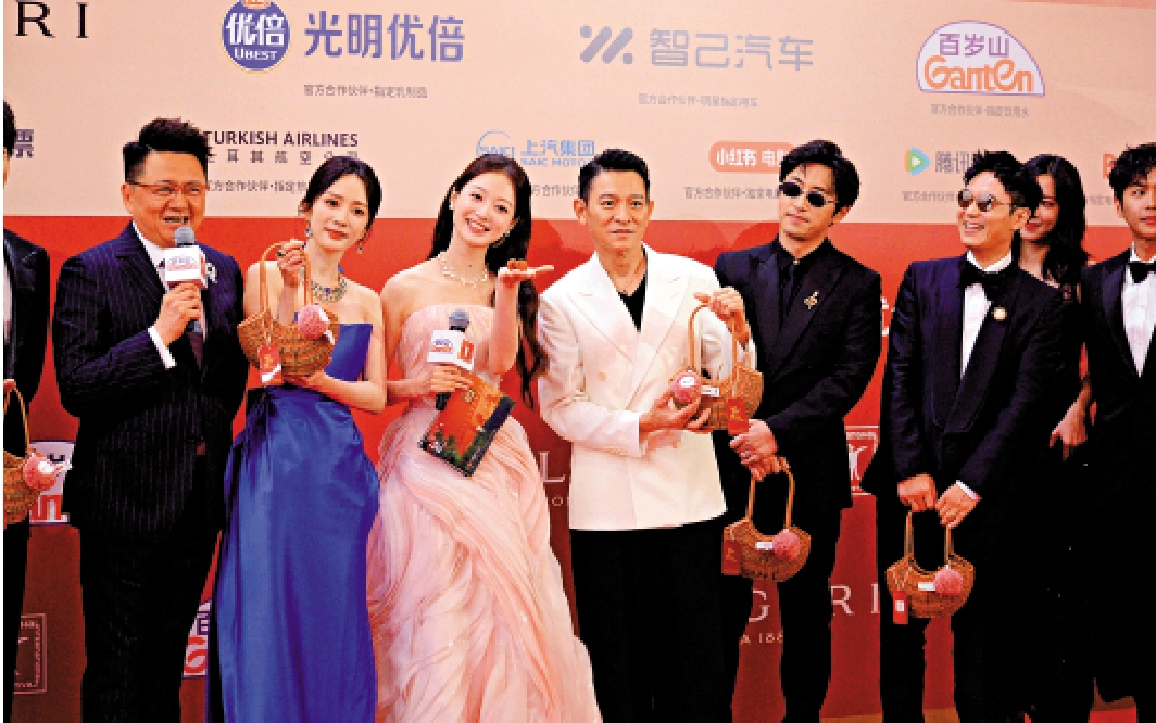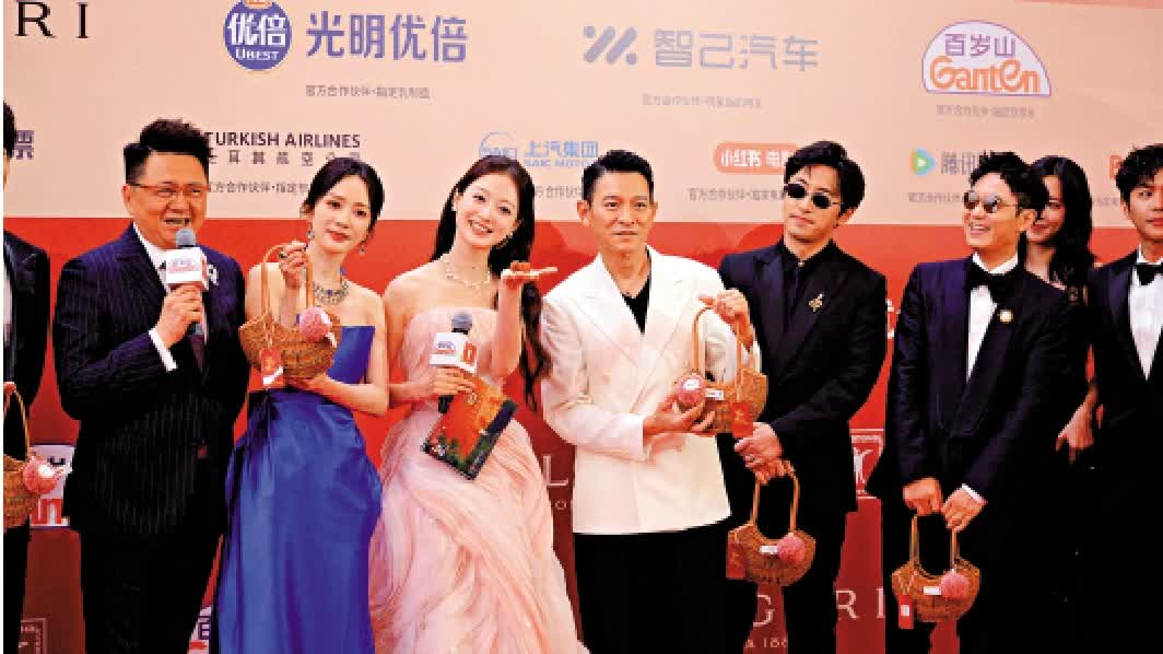 之後不久,劉德華又作為「特別出演」,跟隨《長安的荔枝》劇組二度踏上紅毯,除了將之前的黑色外套換成了白色,還和每個主創一樣手裏拎着一個小籃子上場,籃子裏裝的是新鮮的荔枝。令人忍俊不禁的莫過於當主持人請導演大鵬介紹一下影片看點,他立刻就唱出了大家熟悉的旋律,劉德華的名作《天意》,只是將歌詞改成了「誰在乎我的心裏有多甜」,讓原唱都有點意外。大鵬直言,劉德華上次來上海國際電影節是18年前宣傳《瘋狂的石頭》,而這次是為了他的作品,令他十分榮幸。