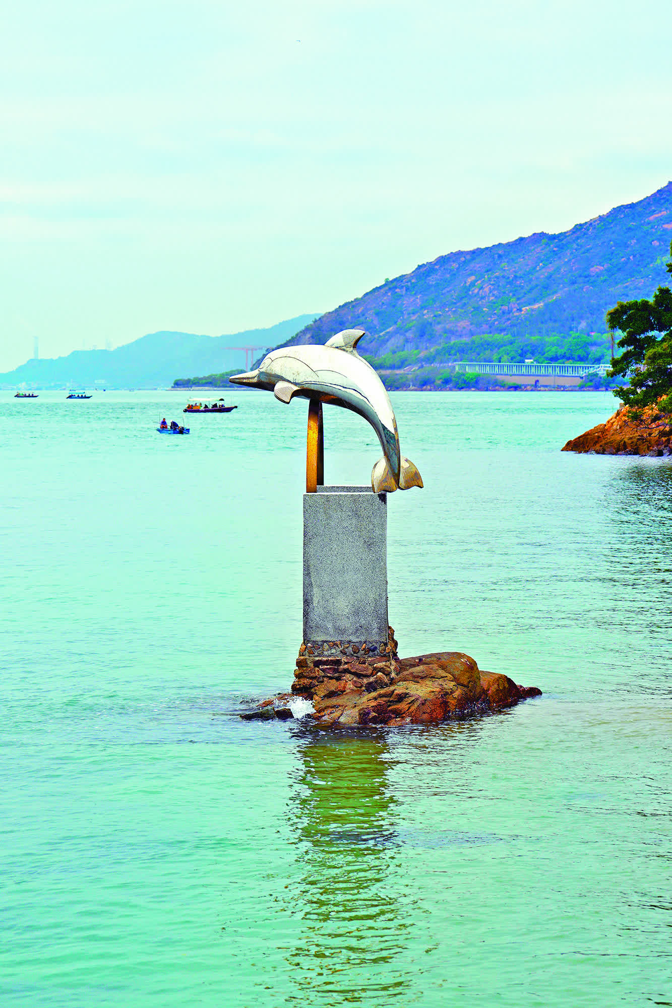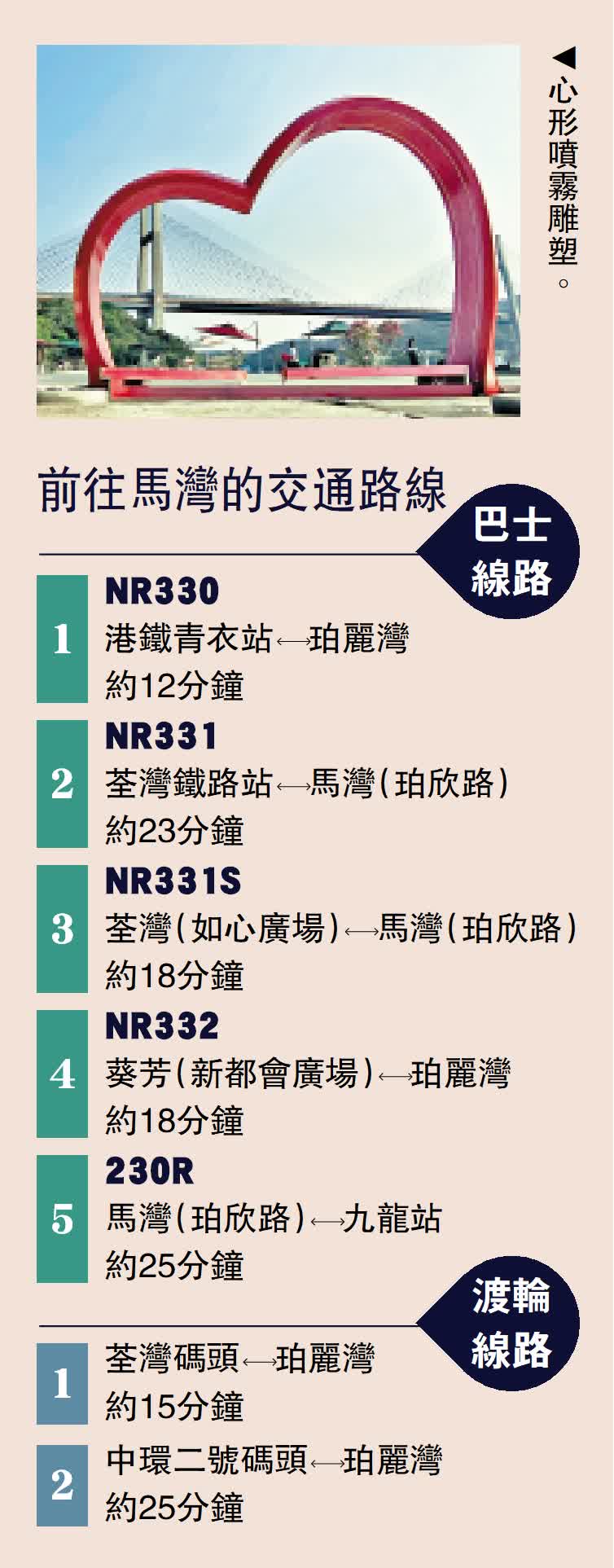 沿着海邊走過心型噴霧雕塑,便可以標誌性的汲水門大橋為背景,攝下動人一刻:站在天后廟廣場可欣賞海天一色的海岸線美景,無論是白天波光粼粼的海面,還是夜晚汲水門大橋的車水馬龍,都別有一番風味。走上通往碼頭的長廊,能看到「奮力」中華白海豚塑像以及不遠處的養殖魚排。「奮力」中華白海豚塑像讓遊客有機會了解馬灣的海洋生物多樣性,而馬灣海魚養殖魚排則講述香港獨有的漁業文化。