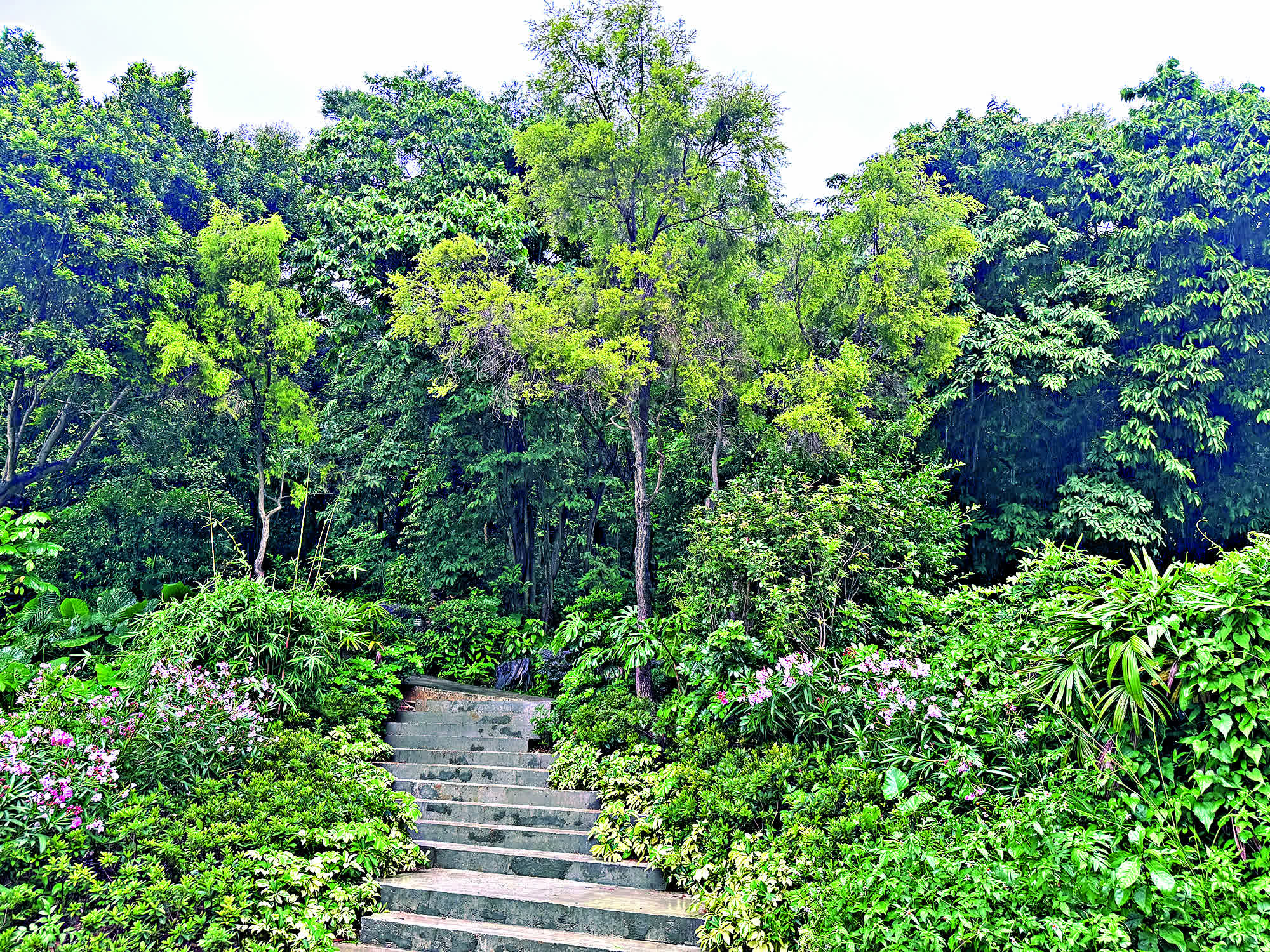 走進公園內的階梯,如同步入一片森林之中,樹葉遮天蔽日,隨風而動。山中能聽鳥鳴,亦能看到路旁種植的作物。往山上走,可以看到園內的古蹟館及再生能源基地。「大自然公園」旁邊的山坡上,就是擁有直徑350毫米的民用真空太陽望遠鏡的「太陽館」,後山則是坐落在鬱鬱葱葱的自然景致中的度假村「太陽村莊」。
