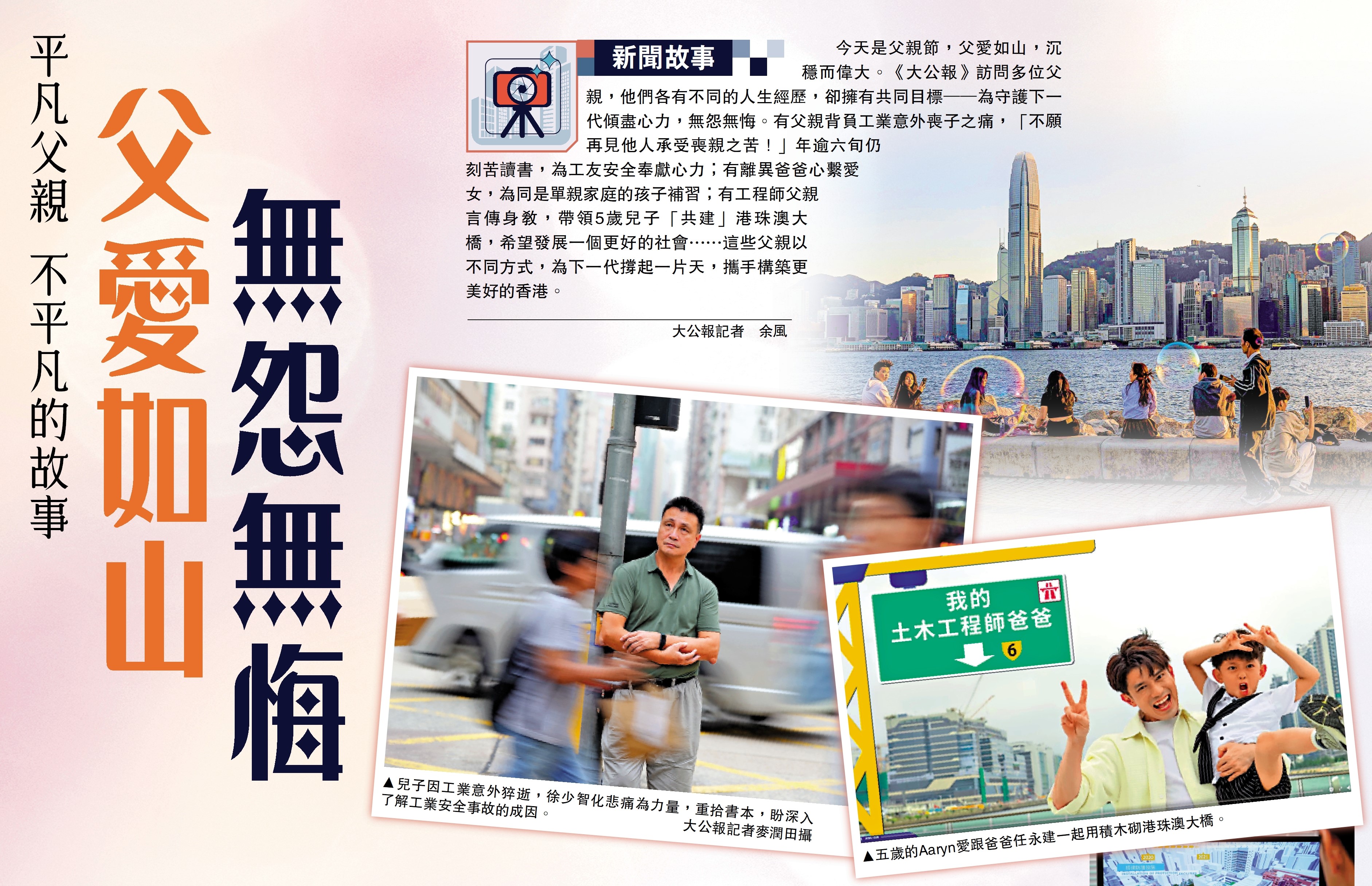 大公報A1版《平凡父親 不平凡的故事》要聞報道。今天是父親節,《大公報》訪問多位父親,他們各有不同的人生經歷,卻擁有共同目標──為守護下一代傾盡心力,無怨無悔。這些父親以不同方式,為下一代撐起一片天,攜手構築更美好的香港。點擊閱讀詳情>>