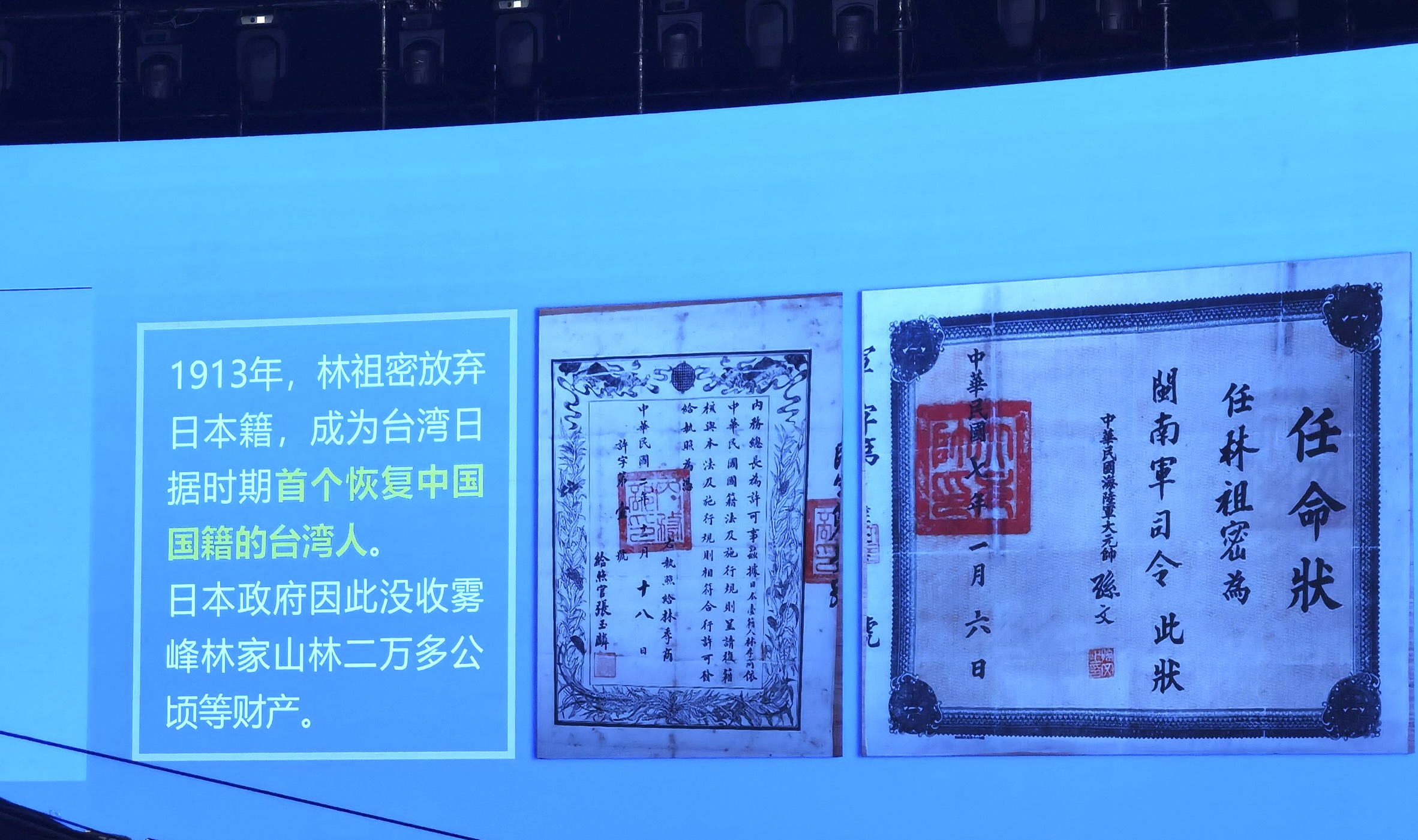 林銘聰介紹,霧峰林家祖籍福建漳州,清代乾隆年間,林家先祖從平和五寨鄉埔坪村赴台墾荒,後發展為台灣知名望族。甲午中日戰爭後,台灣被日寇侵佔,林家開啟了代代相傳的抗爭之路。第六代林朝棟率軍固守抗日;其子林祖密變賣家產資助島內義勇軍,還出資支持孫中山革命事業,並於1913年在廈門鼓浪嶼向日本駐廈門領事館申請放棄日本籍、恢復中國國籍,成為台灣日據時期首個恢復中國國籍的台灣人。