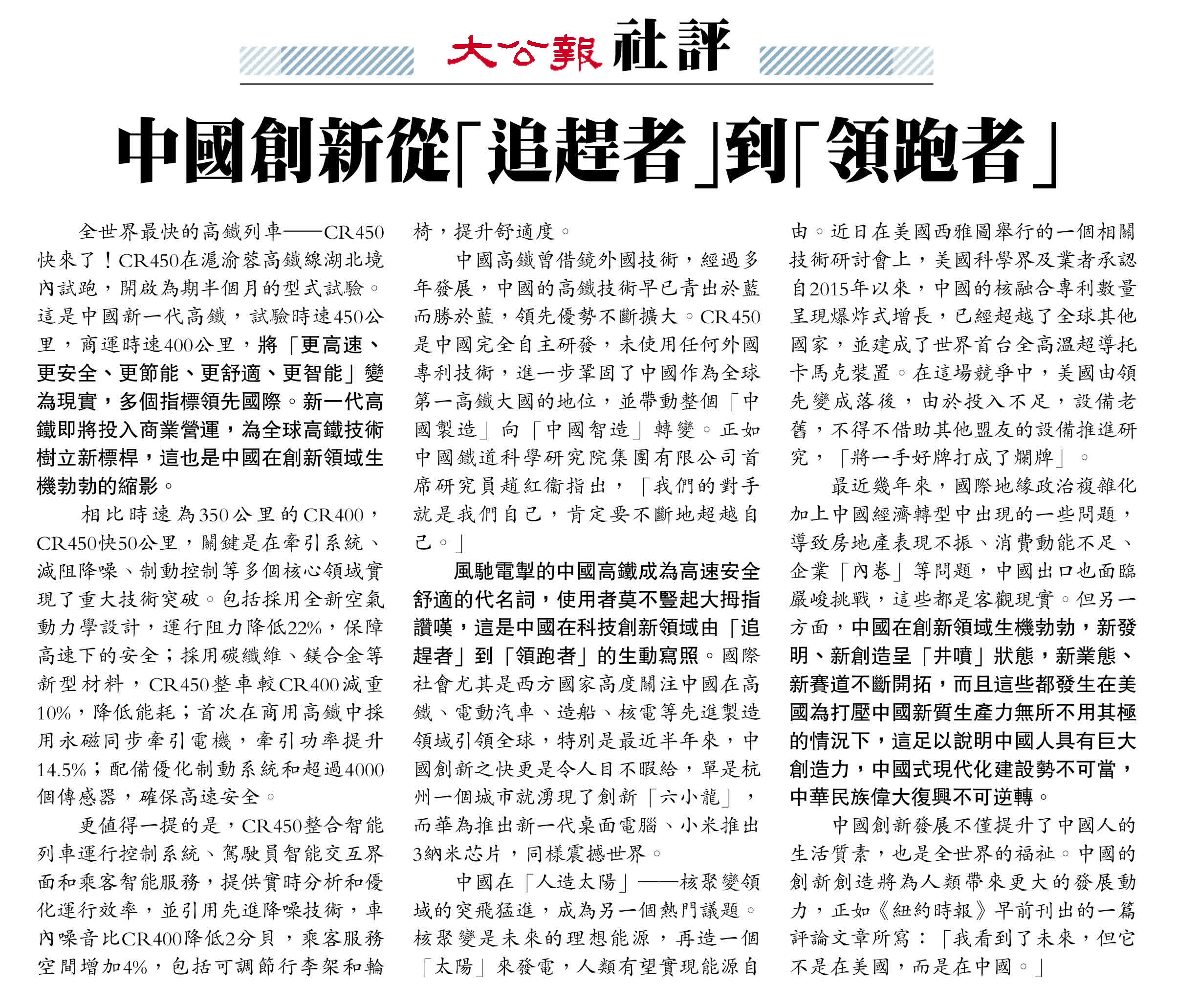 風馳電掣的中國高鐵成為高速安全舒適的代名詞,使用者莫不豎起大拇指讚嘆,這是中國在科技創新領域由「追趕者」到「領跑者」的生動寫照。國際社會尤其是西方國家高度關注中國在高鐵、電動汽車、造船、核電等先進製造領域引領全球,特別是最近半年來,中國創新之快更是令人目不暇給,單是杭州一個城市就湧現了創新「六小龍」,而華為推出新一代桌面電腦、小米推出3納米芯片,同樣震撼世界。