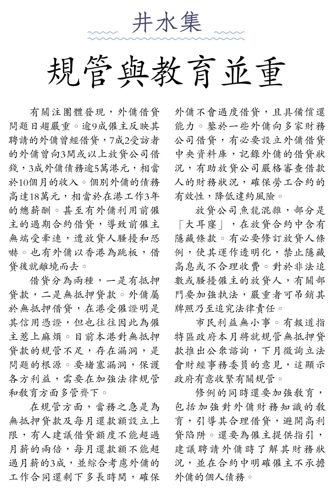 借貸分為兩種,一是有抵押貸款,二是無抵押貸款。外傭屬於無抵押借貸,在港受僱證明是其信用憑證,但也往往因此為僱主惹上麻煩。目前本港對無抵押貸款的規管不足,存在漏洞,是問題的根源。要堵塞漏洞,保護各方利益,需要在加強法律規管和教育方面多管齊下。
