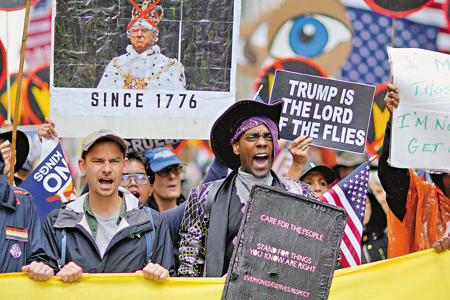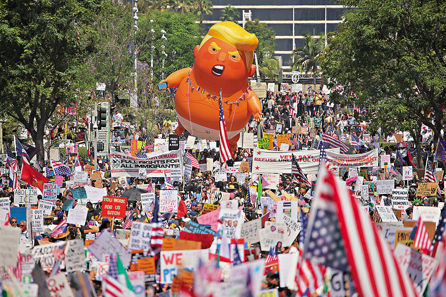 香港文匯報報道,美國總統特朗普上周六(6月14日)迎來79歲生日,同日華盛頓舉行閱兵,紀念美國陸軍成立250周年。然而全美50個州份同步舉行約2,000場聲勢浩大的「無王日」(No Kings Day)抗議活動,數以百萬計民眾走上街頭,高呼「不要國王」等口號,透過倒插美國國旗、懸掛特朗普惡搞公仔等方式,宣洩對特朗普驅逐移民、加徵關稅等連串政策的不滿。