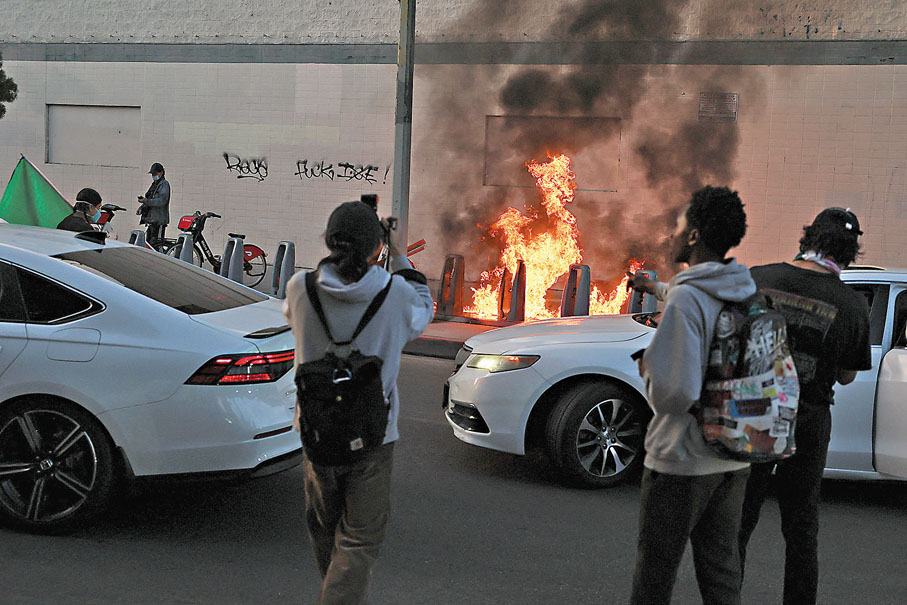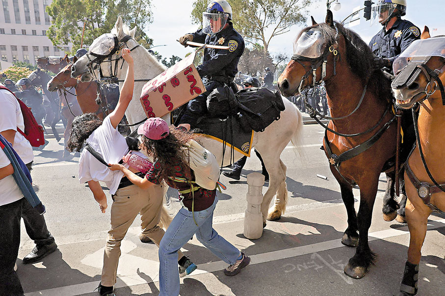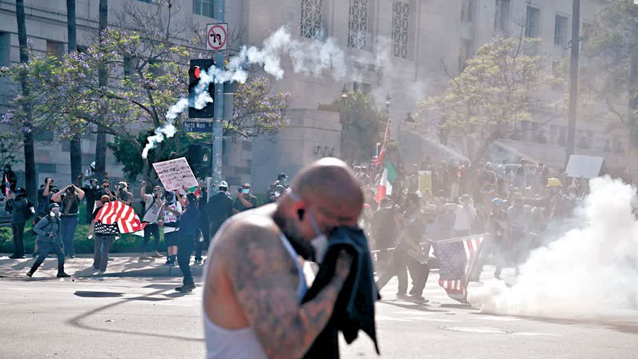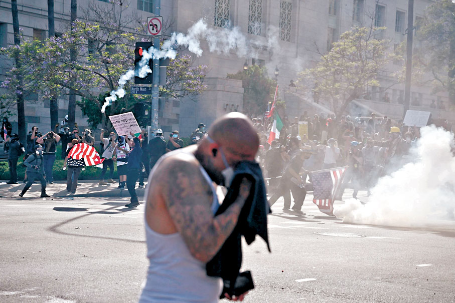但亦有多個城市的示威集會爆發衝突。在國民警衛隊和海軍陸戰隊連日進駐的洛杉磯,當地警方下午4時發布驅散令,使用催淚彈驅散示威者,不過仍有數百名示威者聚集,高呼「你們真可恥」等口號。洛杉磯市檢察官索托表示,市政府將拘捕並起訴任何塗鴉、破壞、搶劫、掟石、違抗警察命令或以其他方式擾亂公共安全的人士。