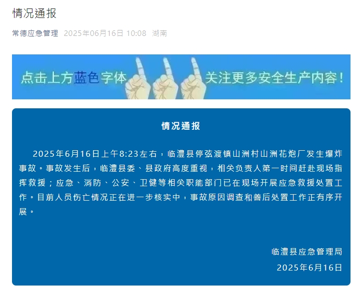 當局指,事故發生後,臨澧縣委、縣政府高度重視,相關負責人第一時間趕赴現場指揮救援;應急、消防、公安、衞健等相關職能部門已在現場開展應急救援處置工作。目前人員傷亡情況正在進一步核實中,事故原因調查和善後處置工作正有序開展。