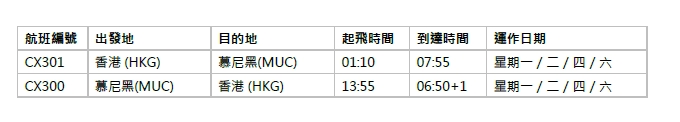 國泰指,往來香港與慕尼黑的航班服務以空中巴士A350-900客機營運,設有配備平臥睡床的商務客艙、寬敞的特選經濟客艙及舒適的經濟客艙以供選擇。