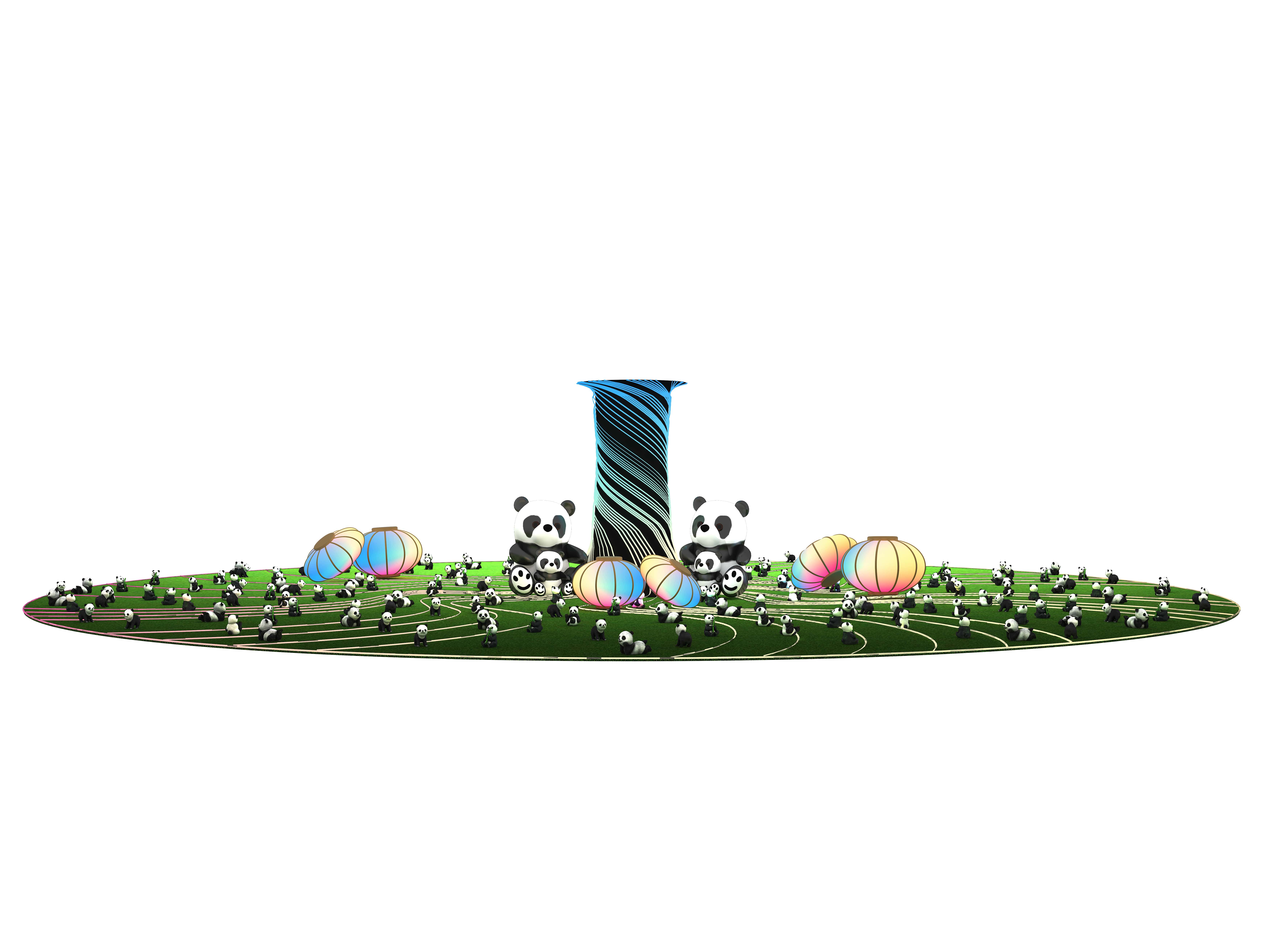 第三展區以「親親大熊貓」為主題,設有兩米高的大熊貓裝置與一百隻可愛小型熊貓裝置,布景中融入光纖設計,特向「光纖之父」高錕致敬。