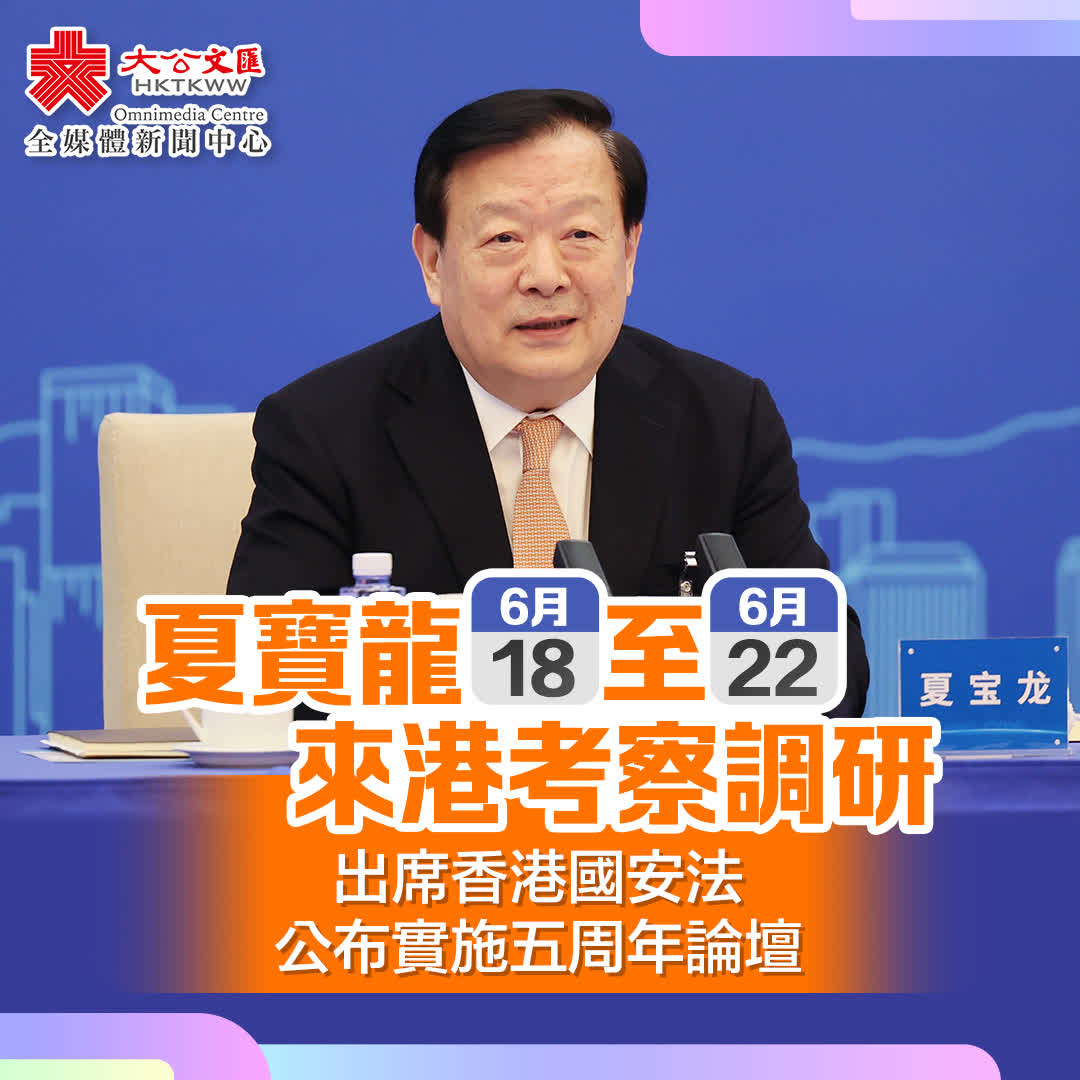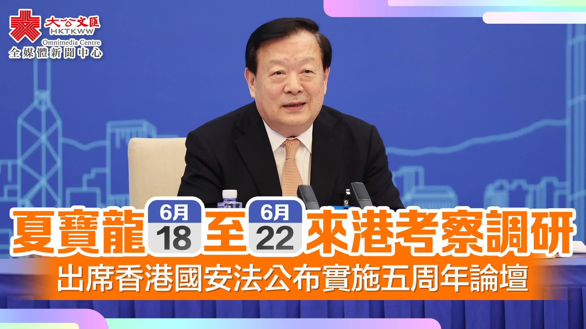 大公文匯全媒體報道,行政長官李家超今日(17日)出席行會前見記者時公布,中央港澳工作辦公室主任、國務院港澳事務辦公室主任夏寶龍將於6月18日至22日來港,出席由特區政府舉辦的香港國安法公布實施五周年論壇,同時對香港經濟和社會發展的最新情況進行考察調研。