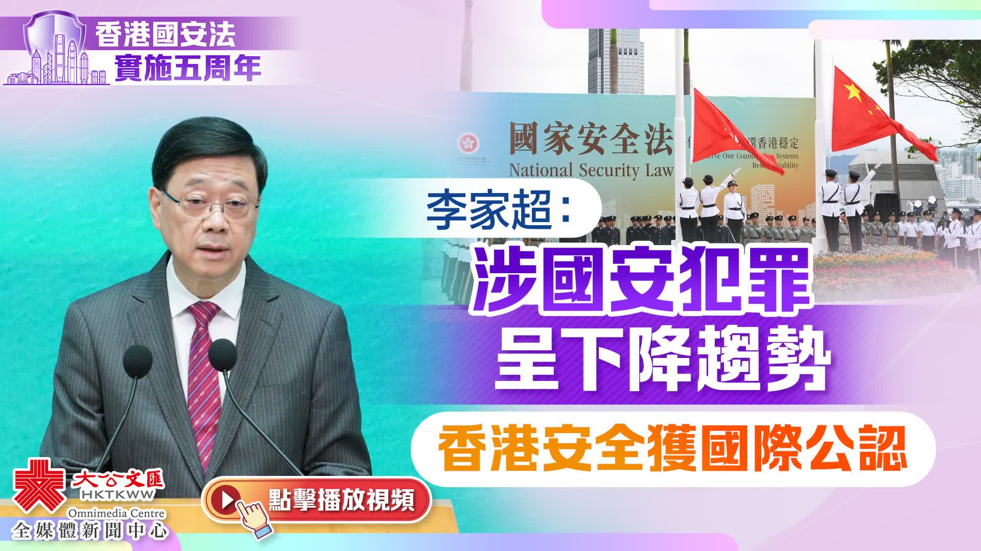 李家超表示,香港在2019年經歷港版「顏色革命」,社會秩序被嚴重破壞,市民遭到任意毆打侮辱,交通隨時可能被堵塞,政府施政也受干擾。回想起2019年的種種場景,都歷歷在目,令人傷痛。而香港國安法的實施,立竿見影地止暴制亂,讓香港再次恢復穩定、安全和秩序,使每位市民能夠正常生活,經濟得以發展。經過香港國安法頒布實施五周年以及警方和其他執法部門的努力,香港的安全不僅得到保障,也獲得公認,最近一些世界性報告,亦將香港列為全球排名第6的安全城市。