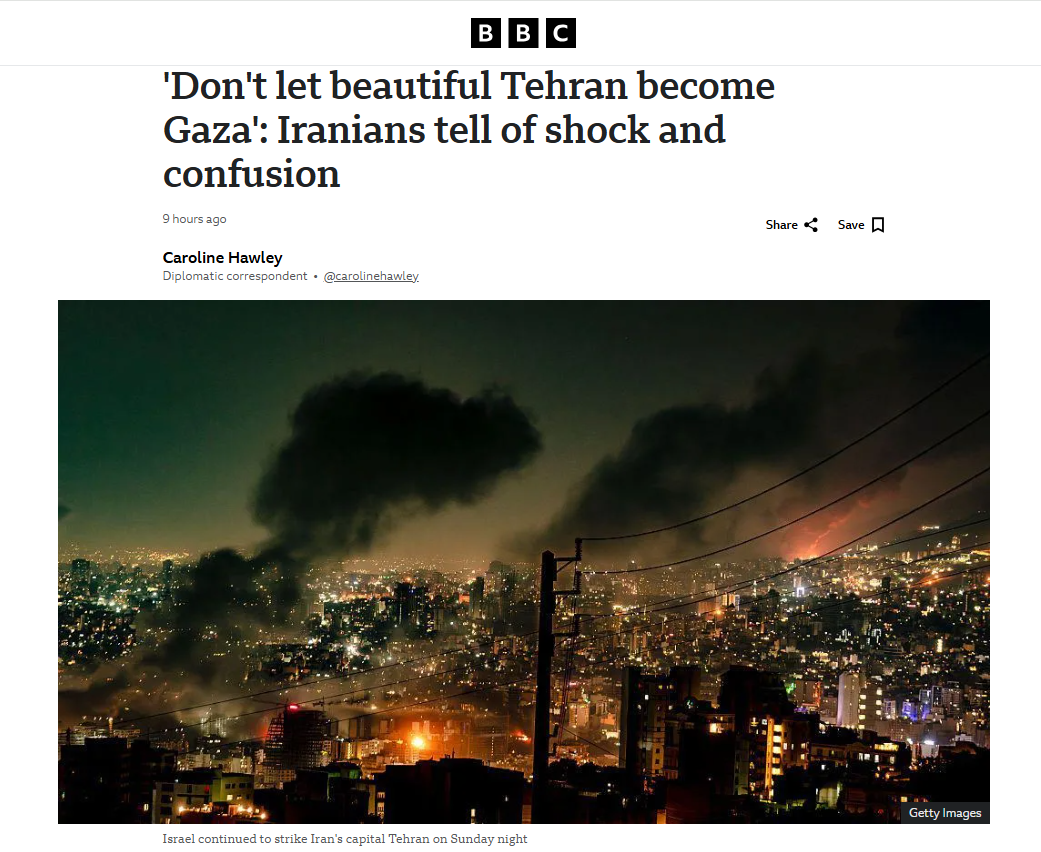 「我們已經好幾晚沒睡覺了,」伊朗一位21歲的音樂系學生說,「大家都走了,唯獨我沒有。我爸爸說,死在自己家裏比逃跑更光榮。」她說:「我真的不希望美麗的德黑蘭變成加沙。」