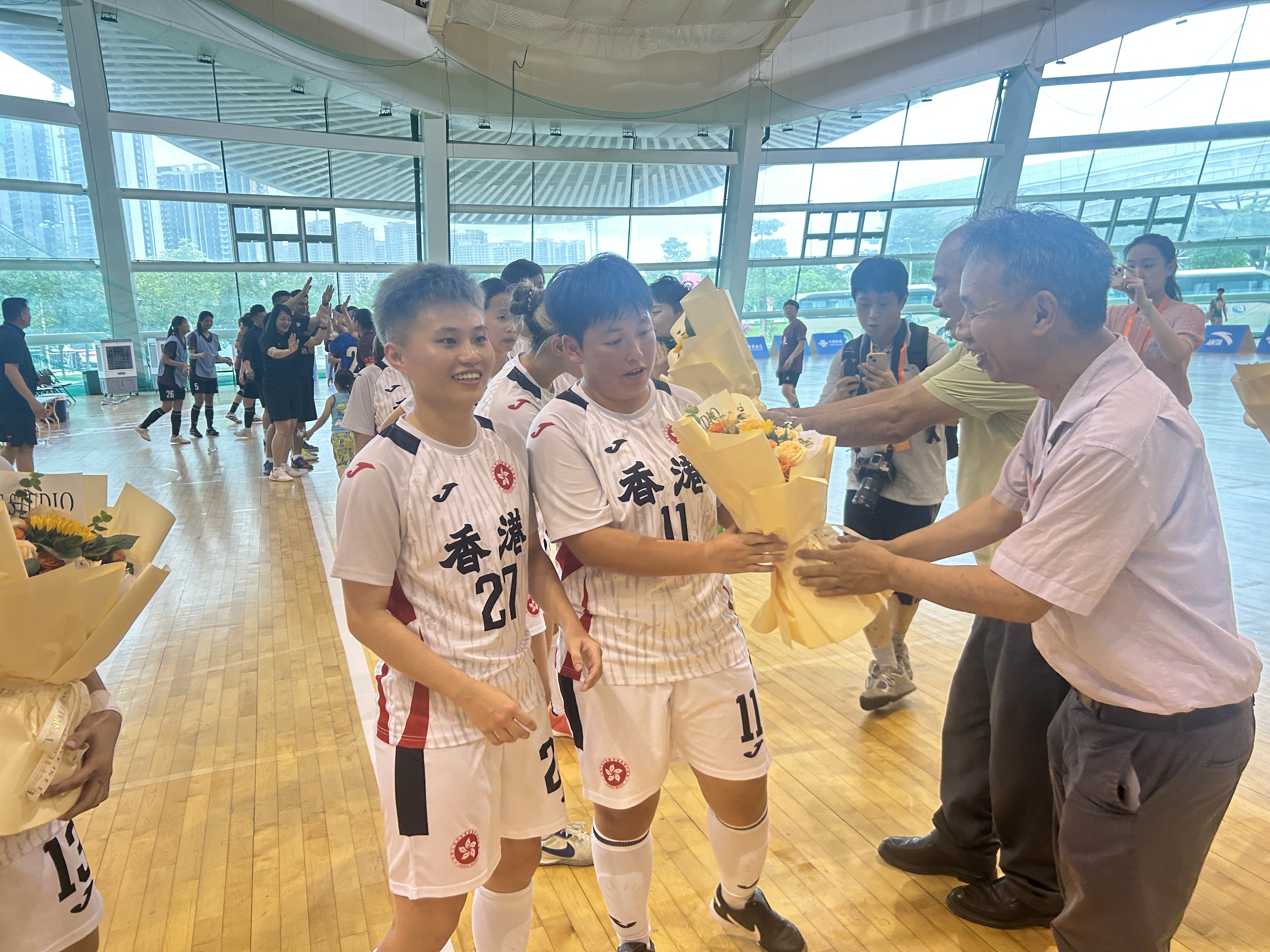 當天的比賽,來自湛江港人聯誼會的20多名在粵港人,來到現場為港隊助威加油。球員拚完最後一點體能,拚搏精神令人感動。比賽後,港人「啦啦隊」每一位球員和教練員獻上鮮花,表達對她們的敬意。