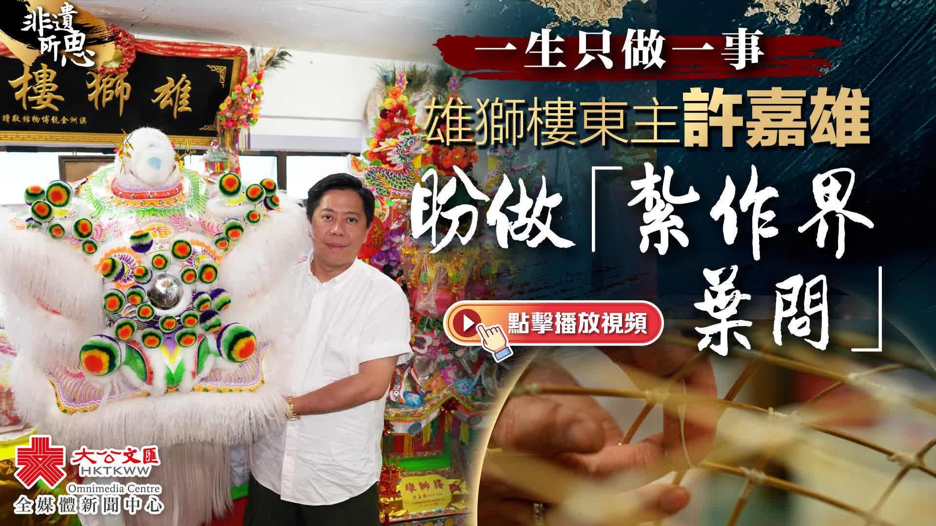 6歲,許嘉雄在武館修補舊獅頭;11歲,他紮出人生中第一隻獅頭。後來,許嘉雄提着獅頭四處找紙紮舖,直到被老師傅看中入了行。十多年後,他成立「雄獅樓」,繼續自己的紮作事業。