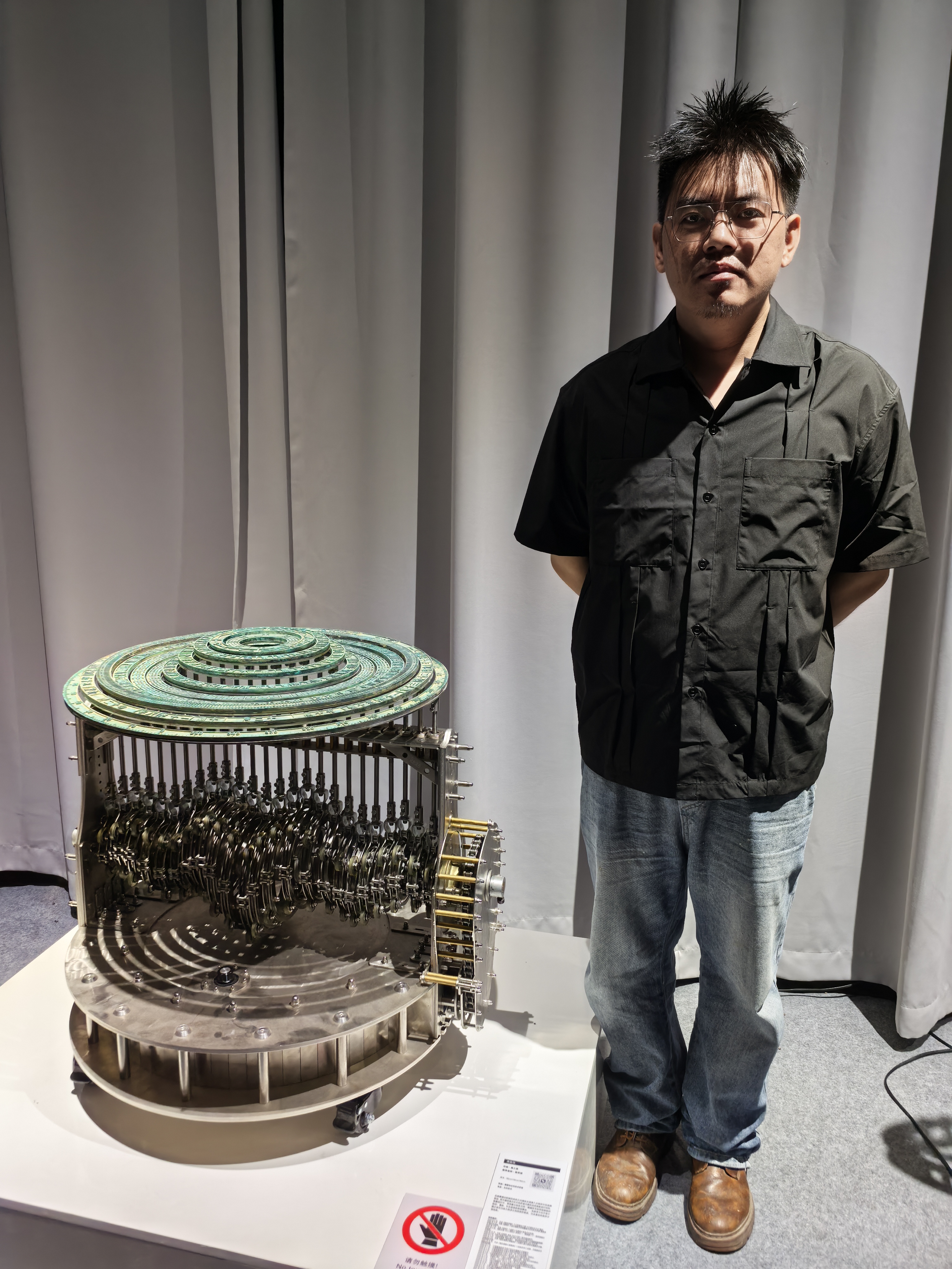 雕塑與公共藝術學院以「恒穩態群島」為題,集結159位畢業生的創作成果,作品涵蓋雕塑、裝置、影像、織物、AR互動、空間營造等多樣媒介。聶士昌畢業作品共展出了五件裝置藝術,其中作品《滴動儀》將水波紋與古代羅盤同構,青銅質感搭配機械科技感,借水滴漣漪探討中式哲學中微小變化與宏大秩序的聯繫,在社交媒體成為爆款作品。
