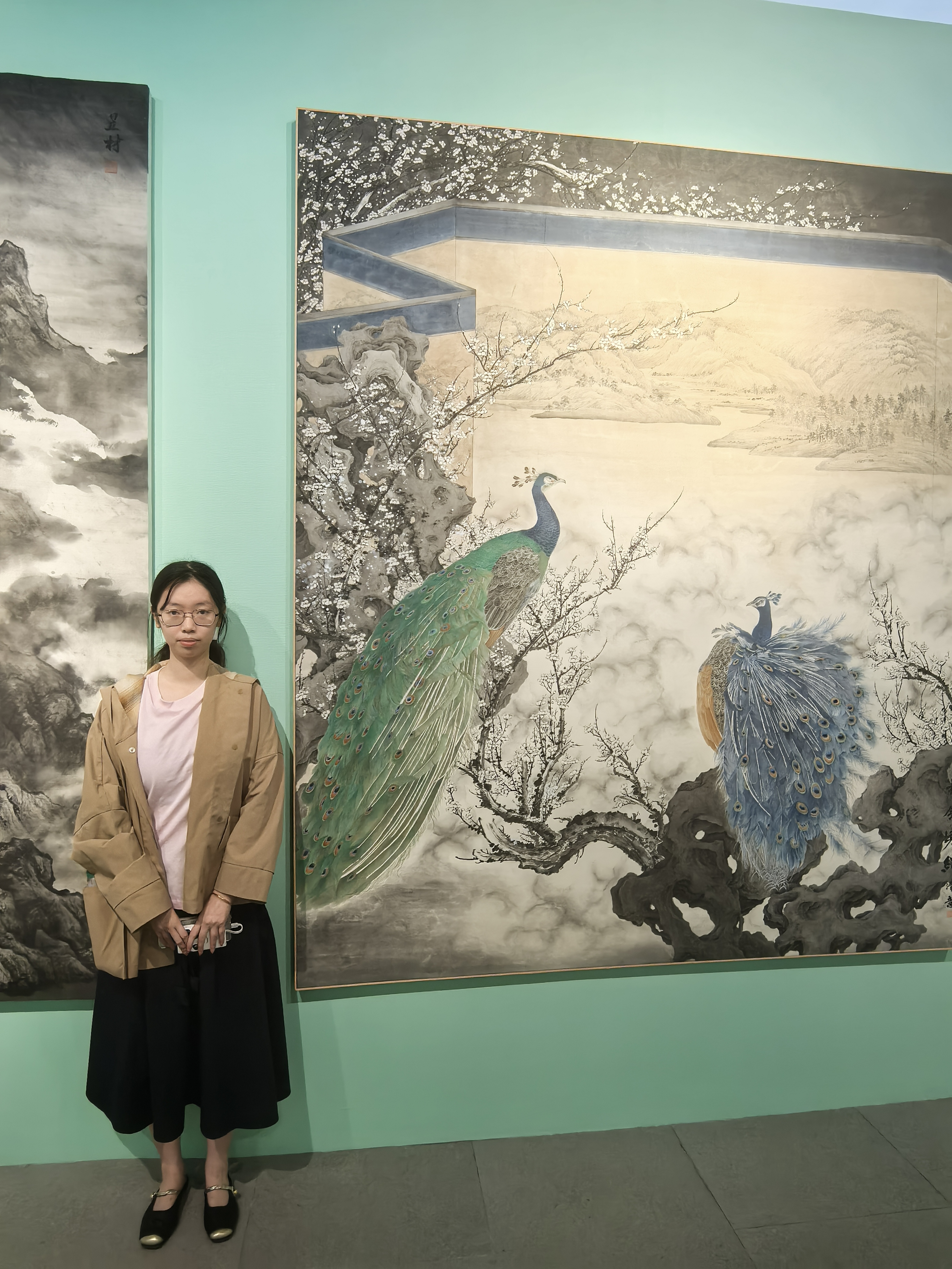 中國畫學院從「夏蟲語冰」切入,將莊子對時空局限的哲思與黃賓虹的「蝶說」並置,構建起中國畫學院本碩博157位學子的創作方法論。中國畫學院中國畫山水專業本科畢業生邵若栩的《與AI討論七次「明月出天山」》,以李白詩句為載體,構建「AI—國畫—AI—國畫」的鏈式創作。算法生成的虛擬山水與傳統筆墨在「詩性造境」中共振,展現技術與文脈的對話。