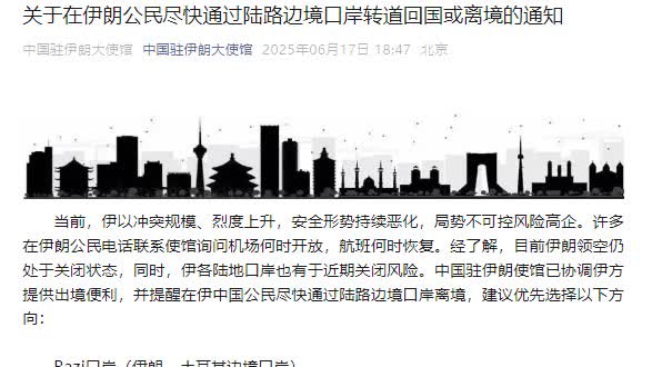 大公文匯網報道,中國駐伊朗大使館17日發布通知,提醒在伊中國公民盡快通過陸路邊境口岸離境或轉道回國,使館已協調伊朗方面提供出境便利。
