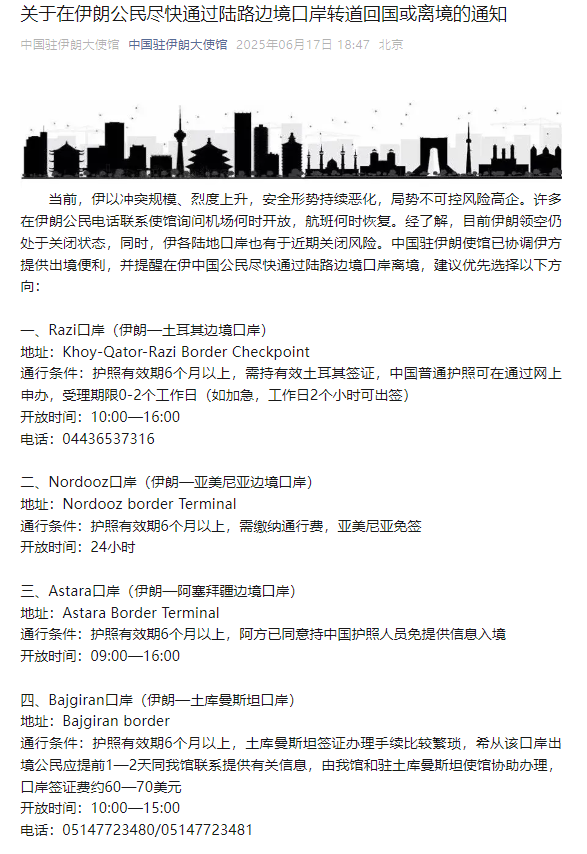 當前,伊朗和以色列衝突規模、烈度上升,安全形勢持續惡化,局勢不可控風險高企。許多在伊中國公民電話聯繫使館詢問機場何時開放,航班何時恢復。經了解,目前伊朗領空仍處於關閉狀態,伊各陸路口岸也有於近期關閉風險。中國駐伊朗大使館已協調伊方提供出境便利,並提醒在伊中國公民盡快通過陸路邊境口岸離境。