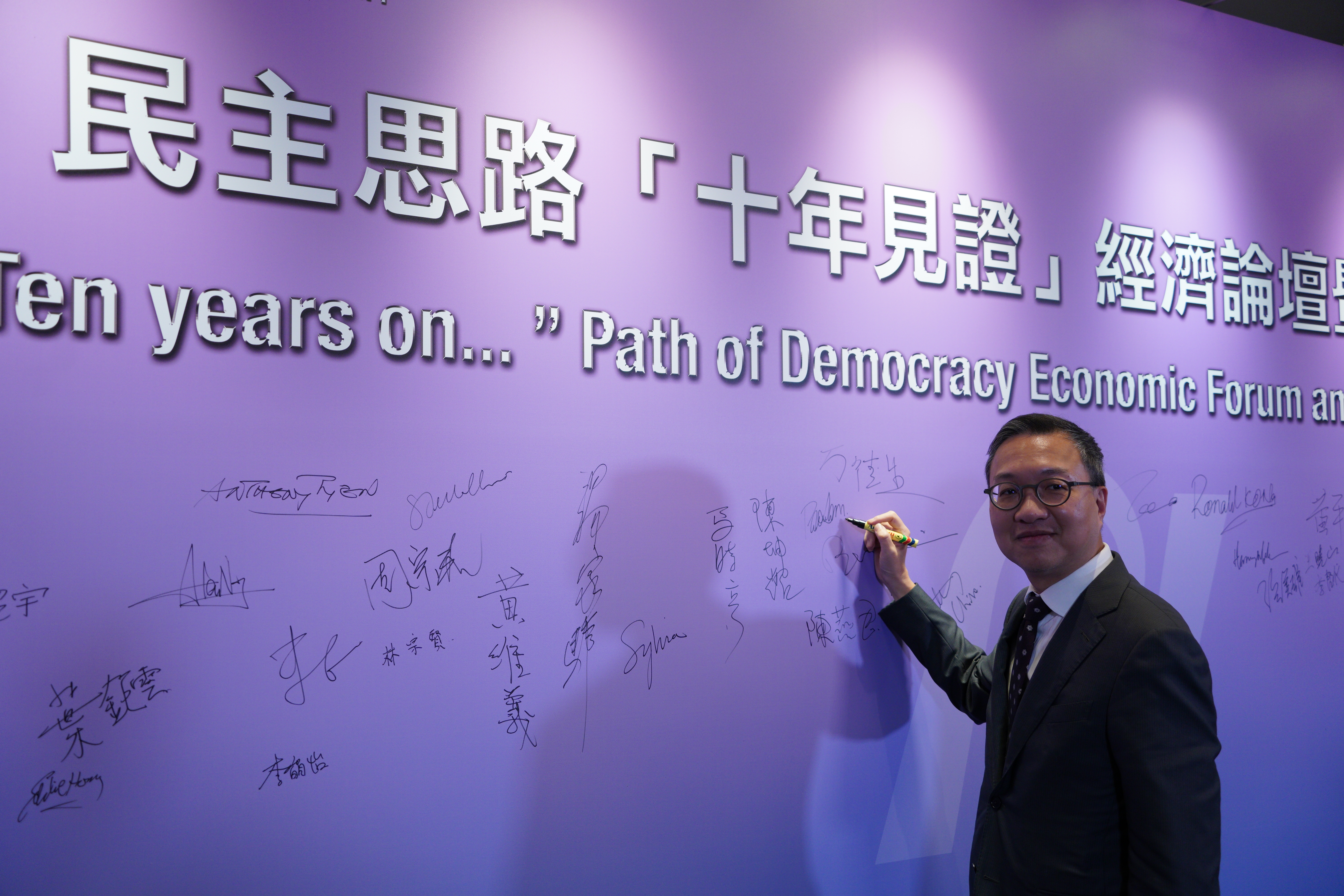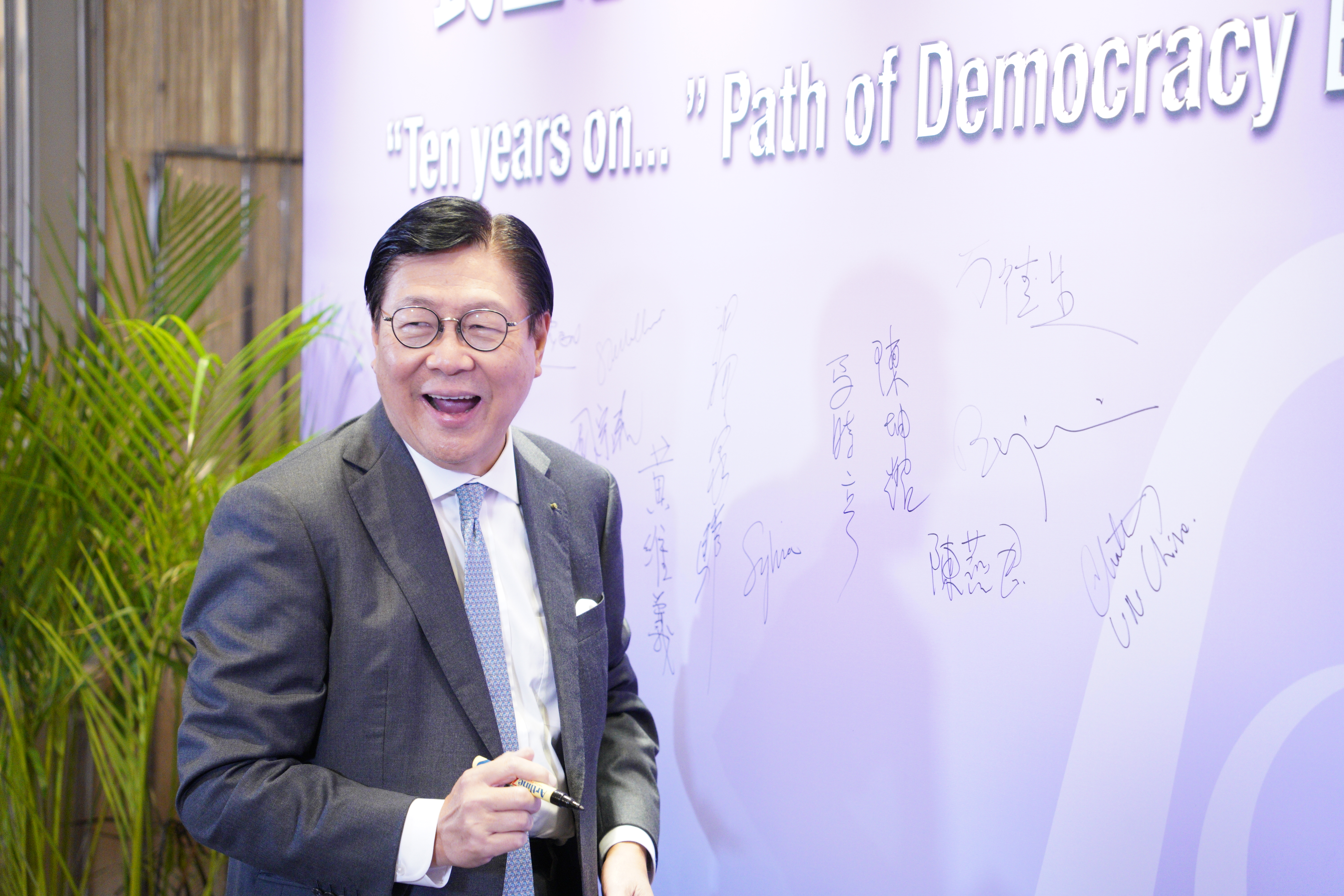 他還提到,「特首政策組」是在他上任後成立的,其前身也是一個智庫。民主思路在培育本地人才、深入了解「一國兩制」政策、協助政府制定策略方面發揮了重要作用。如今,民主思路已經走過了十個年頭,進入了一個新的發展階段。他希望未來能夠發揮橋樑作用,推動理性對話,促進惠民政策的實施,以及推動經濟和重點產業引入。